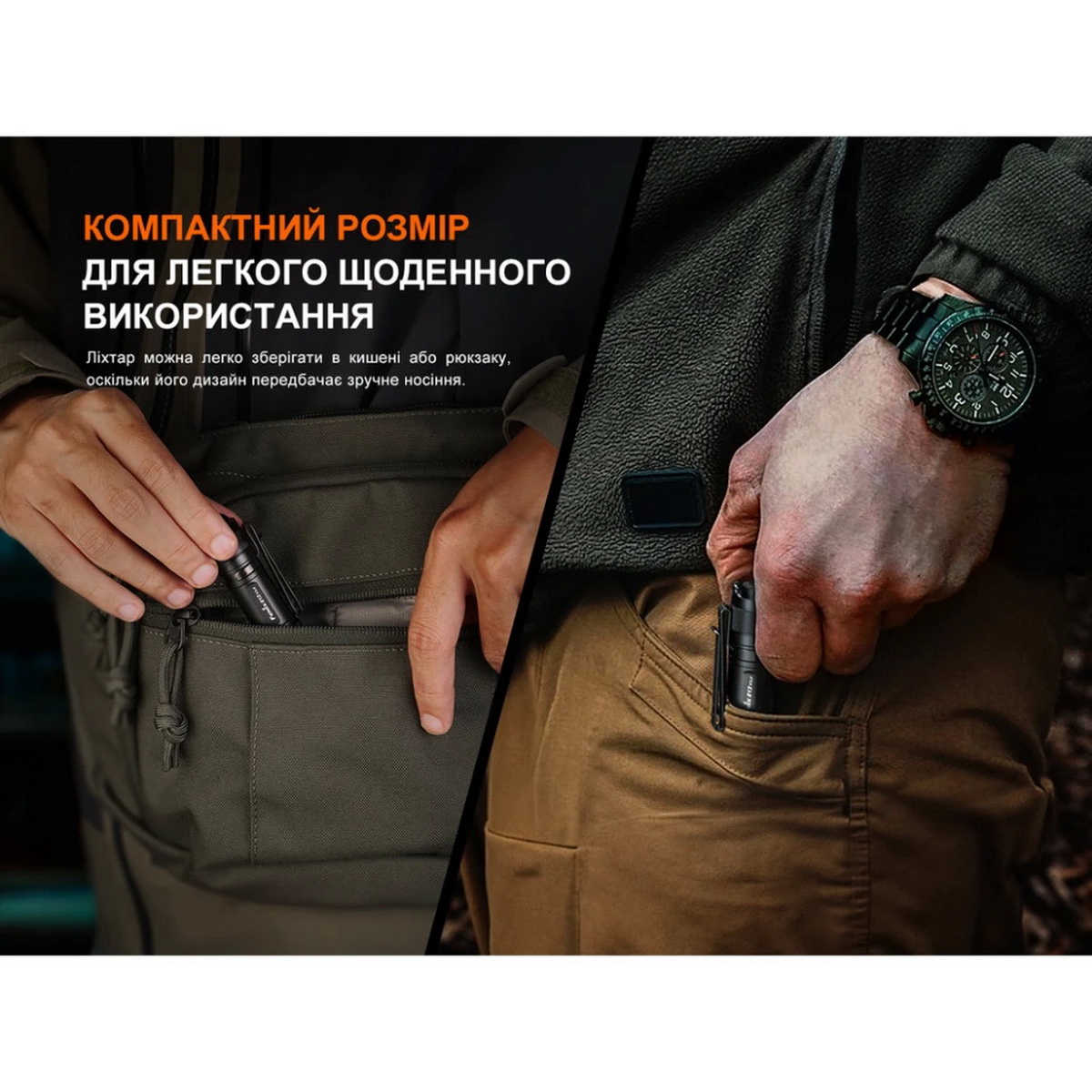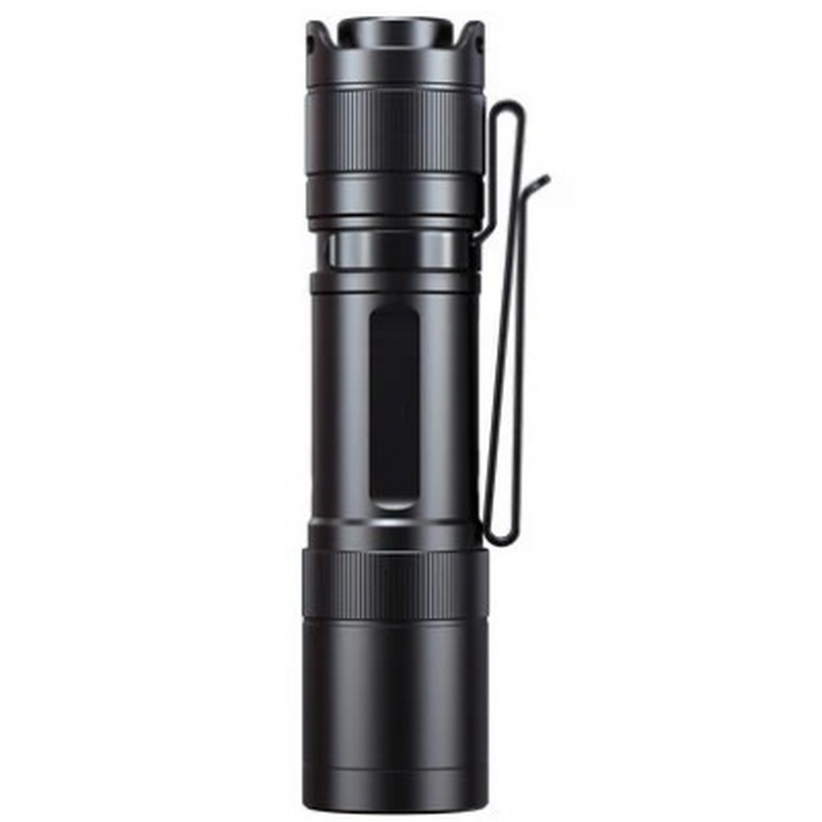 Живлення забезпечується від стандартної батарейки АА, це робить пристрій максимально універсальним та зручним у використанні, адже такі елементи живлення доступні будь-де. Час автономної роботи на одному заряді досягає 100 годин у найекономнішому режимі, дозволяючи ліхтарю бути ефективним навіть у довготривалих поїздках. Разом із батарейкою його вага становить лише 54 грами, що робить його легким та практичним для щоденного носіння. У хвостовій частині передбачено магніт, який дозволяє закріплювати ліхтар на металевих поверхнях, а також зручну кліпсу, завдяки якій його можна прикріпити до кишені, ременя чи рюкзака.