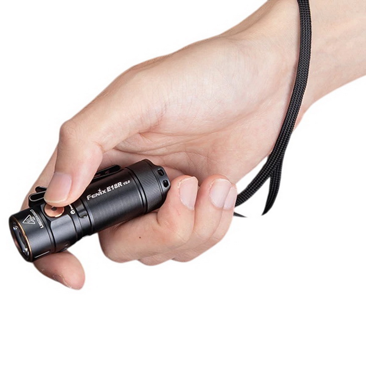 Ліхтар працює від фірмового літій-іонного акумулятора ARB-L16-700P місткістю 700 мАг, який постачається в комплекті. Завдяки сучасній електроніці, максимальний час роботи в мінімальному режимі сягає 200 годин. Зарядка акумулятора відбувається швидко та зручно через вбудований у корпус водозахищений порт USB Type-C, який дозволяє використовувати для зарядки кабель від смартфона або павербанк. При вазі всього 56 грамів разом з акумулятором, цей ліхтар є одним із найлегших у своєму класі. Для максимальної зручності носіння передбачена двостороння сталева кліпса, за допомогою якої Fenix E18R V2.0 можна закріпити на кишені, спорядженні або на козирку кепки, використовуючи його як імпровізований налобник.