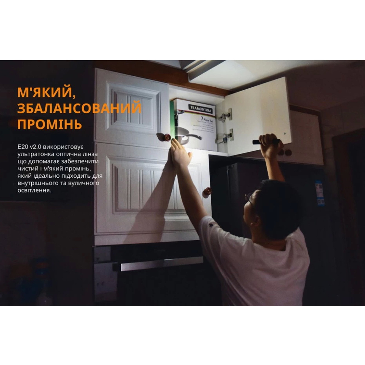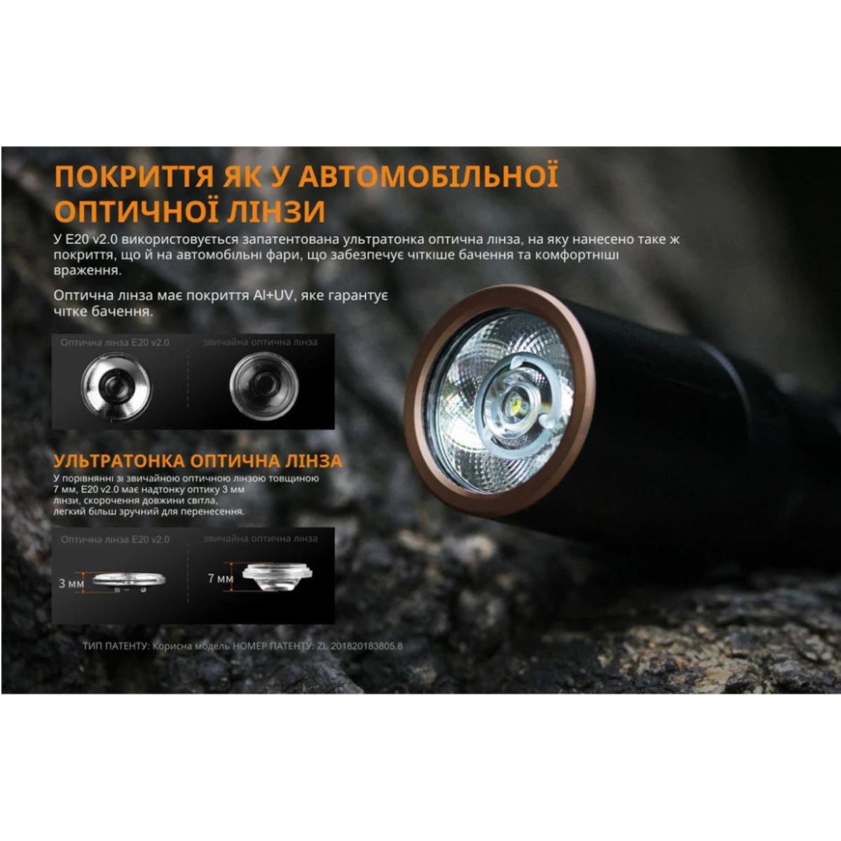 Світловий промінь моделі E20 V2.0 має ефективну дальність дії до 126 метрів, дозволяючи користувачеві впевнено орієнтуватися як у приміщенні, так і на відкритій місцевості. Для адаптації під різні завдання передбачено 4 режими яскравості, серед яких можна вибрати оптимальний варіант — від економного для тривалого підсвічування до максимально потужного для огляду на значній відстані. Ліхтар оснащений системою цифрового регулювання, яка підтримує стабільний рівень світлового потоку незалежно від рівня заряду батарей. Додатково реалізовано захист від перегрівання, що дозволяє уникнути пошкодження світлодіода під час тривалого використання у високопродуктивних режимах. У конструкції використана ультратонка оптична лінза, поверхня якої покрита шаром AI+UV, завдяки чому промінь стає більш рівномірним та чистим, а сама лінза отримує додатковий захист від подряпин та зовнішніх впливів.