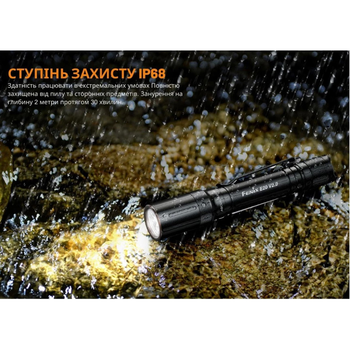 Корпус Fenix E20 V2.0 виготовлений із високоякісного алюмінієвого сплаву A6061-T6, який пройшов анодування за стандартом HAIII, це забезпечує підвищену стійкість до корозії та механічних ушкоджень. Завдяки цьому ліхтар зберігає привабливий вигляд і робочі властивості навіть після тривалого використання в складних умовах. Керування здійснюється за допомогою зручно розташованої кнопки у верхній частині корпусу, що робить процес перемикання режимів максимально простим і інтуїтивним. Для додаткового захисту передбачена ударостійкість з витримуванням падінь з висоти до 1 метра, а також повна водонепроникність стандарту IP68, дозволяючи занурювати ліхтар у воду на глибину до двох метрів без ризику пошкодження.