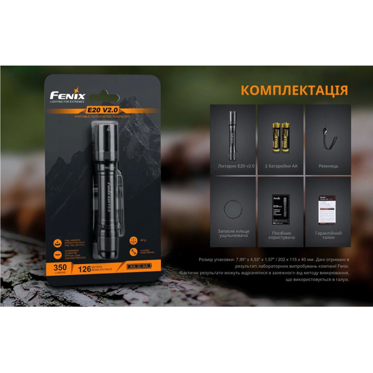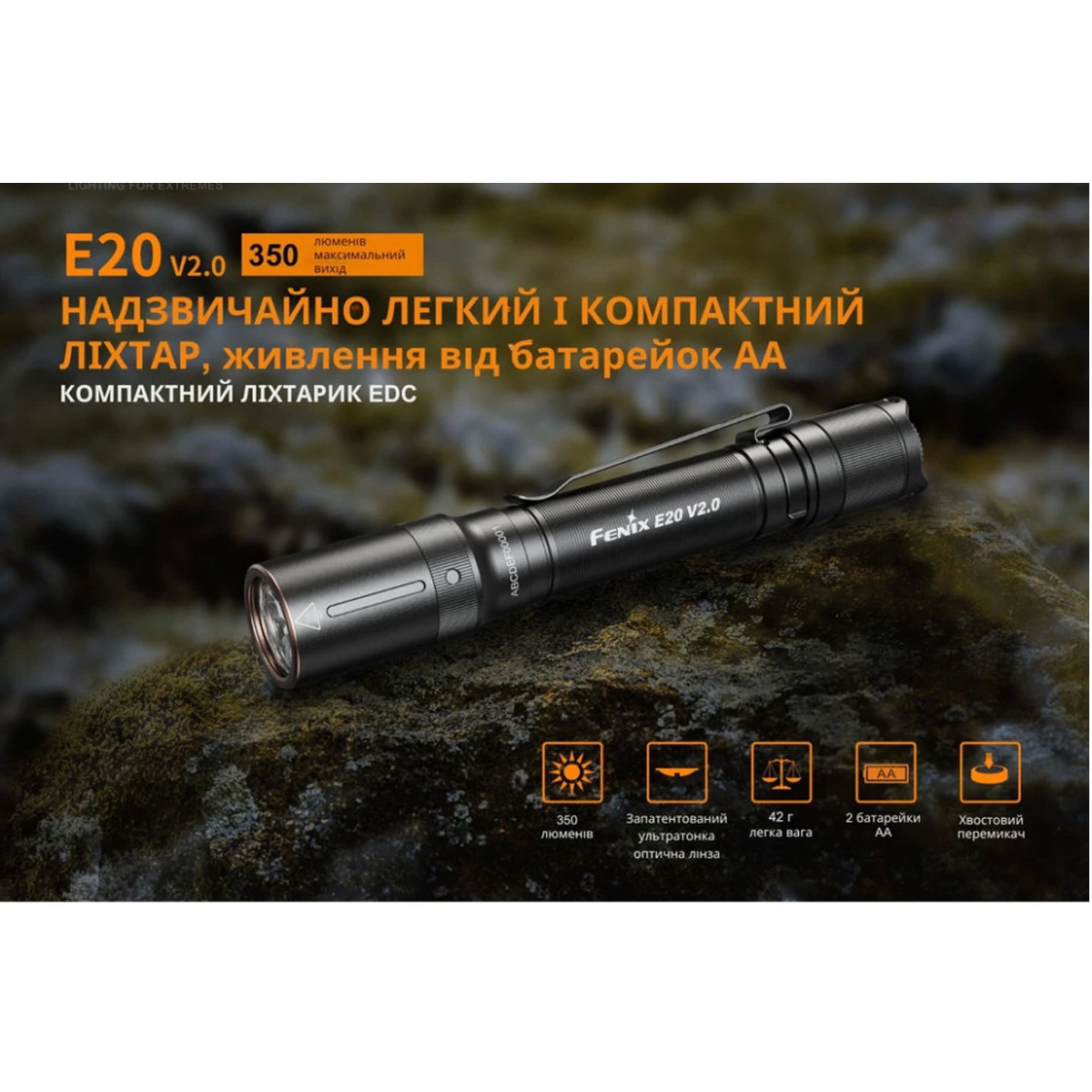 Ліхтар Fenix E20 V2.0 — це збалансований та надійний кишеньковий ліхтар, який поєднує компактність, потужність і міцність. Він однаково добре підійде як для повсякденного застосування, так і для активного відпочинку, забезпечуючи користувачеві стабільне світло у будь-якій ситуації.