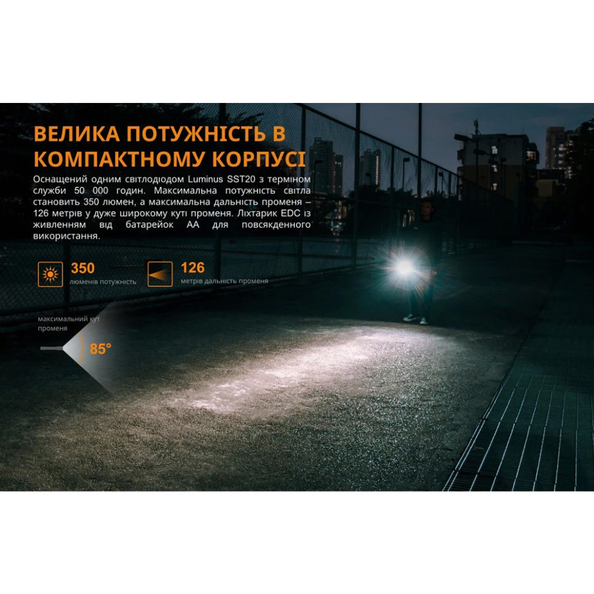 Ліхтар Fenix E20 V2.0 — це універсальний освітлювальний інструмент, розроблений для повсякденного використання, подорожей, туризму, а також як надійний помічник у побутових чи робочих умовах. Пристрій забезпечує стабільний світловий потік у 350 люменів, чого достатньо для комфортного освітлення середніх і далеких відстаней. Джерелом світла виступає сучасний світлодіод Luminus SST20, який відзначається високою ефективністю та збалансованим світловим пучком. Його робочий ресурс становить 50 000 годин, гарантуючи багаторічну безперебійну експлуатацію навіть за інтенсивного використання. Завдяки цьому ліхтар стає надійним вибором для користувачів, які цінують довговічність і стабільну роботу в будь-яких умовах.
