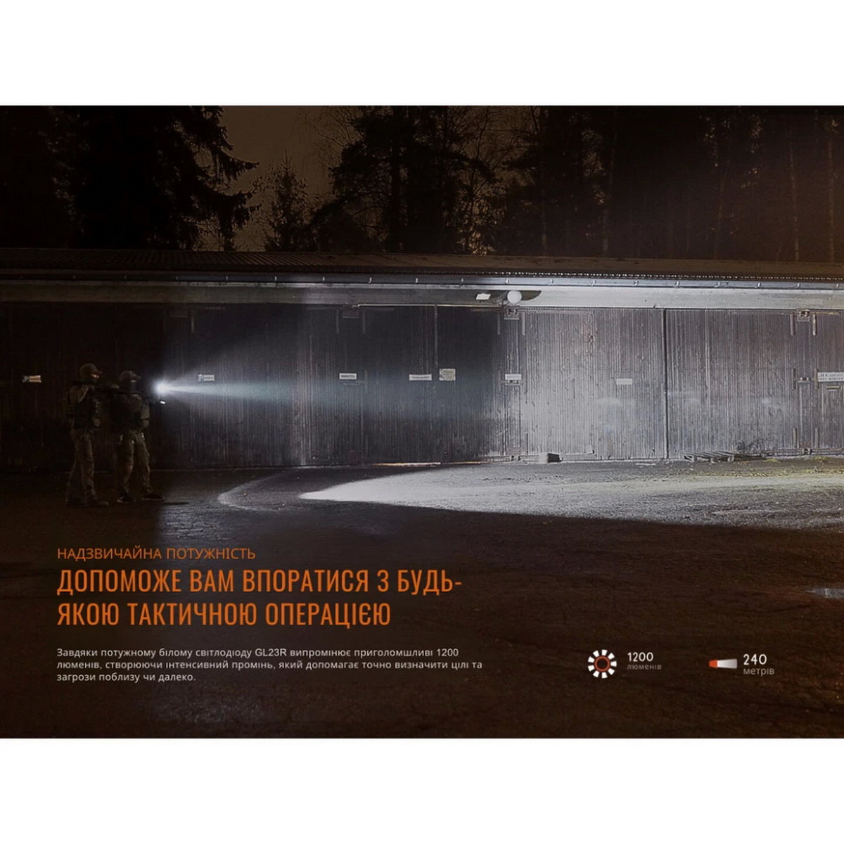 Fenix GL23R — це надійний підствольний ліхтар, розроблений для забезпечення максимальної тактичної переваги у стрільбі. Його основне призначення — встановлення на вогнепальну зброю для освітлення цілей та швидкого прицілювання в умовах низької видимості. Завдяки універсальному кріпленню, ліхтар сумісний з більшістю повнорозмірних пістолетів, оснащених стандартними планками GLOCK® або MIL-STD-1913 (Picatinny), роблячи його універсальним рішенням для широкого спектра зброї. В основі освітлювальної системи лежить потужний світлодіод Luminus SFT40, що генерує інтенсивний світловий потік у 1200 люменів з холодною колірною температурою 6500K. Таке світло надає відмінну видимість та ідентифікацію об'єктів на значній відстані. Спеціально розроблена оптика формує чітко сфокусований промінь, здатний долати дистанцію у 240 метрів, дозволяючи стрільцю повністю контролювати ситуацію.