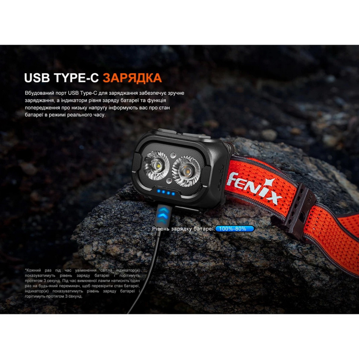 Ліхтар може працювати як від фірмового акумулятора Fenix ARB-LP1900, що йде у комплекті, так і від трьох стандартних батарейок формату ААА. Це робить його надзвичайно практичним у тривалих походах, де немає доступу до електромережі. Зарядка комплектного акумулятора відбувається через сучасний та зручний порт USB Type-C, дозволяючи швидко поповнити запас енергії. Вага ліхтаря становить всього 103 грами, роблячи його практично невідчутним на голові та ідеальним для динамічних активностей, де кожен грам має значення.