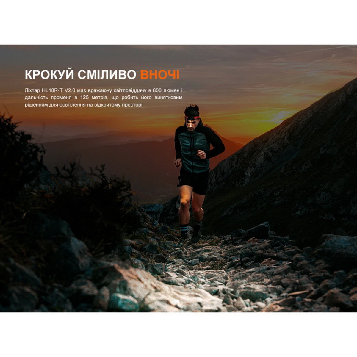Оптична система ліхтаря пропонує чіткий і сфокусований промінь, що досягає відстані у 125 метрів, завдяки чому користувач може заздалегідь бачити будь-які перешкоди та впевнено орієнтуватися в темряві. Fenix HL18R-T V2.0 пропонує 10 режимів освітлення: кілька рівнів інтенсивності білого світла, червоне світіння в постійному режимі та сигнальний SOS. Завдяки цьому можна вибрати оптимальний варіант для різних умов — від швидкого бігу до повільної прогулянки чи відпочинку в наметовому таборі. Щоб користувач завжди контролював залишок заряду, ліхтар має індикатор, який сигналізує про рівень енергії.