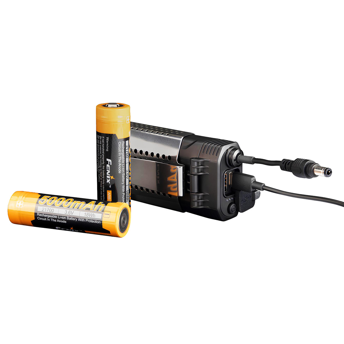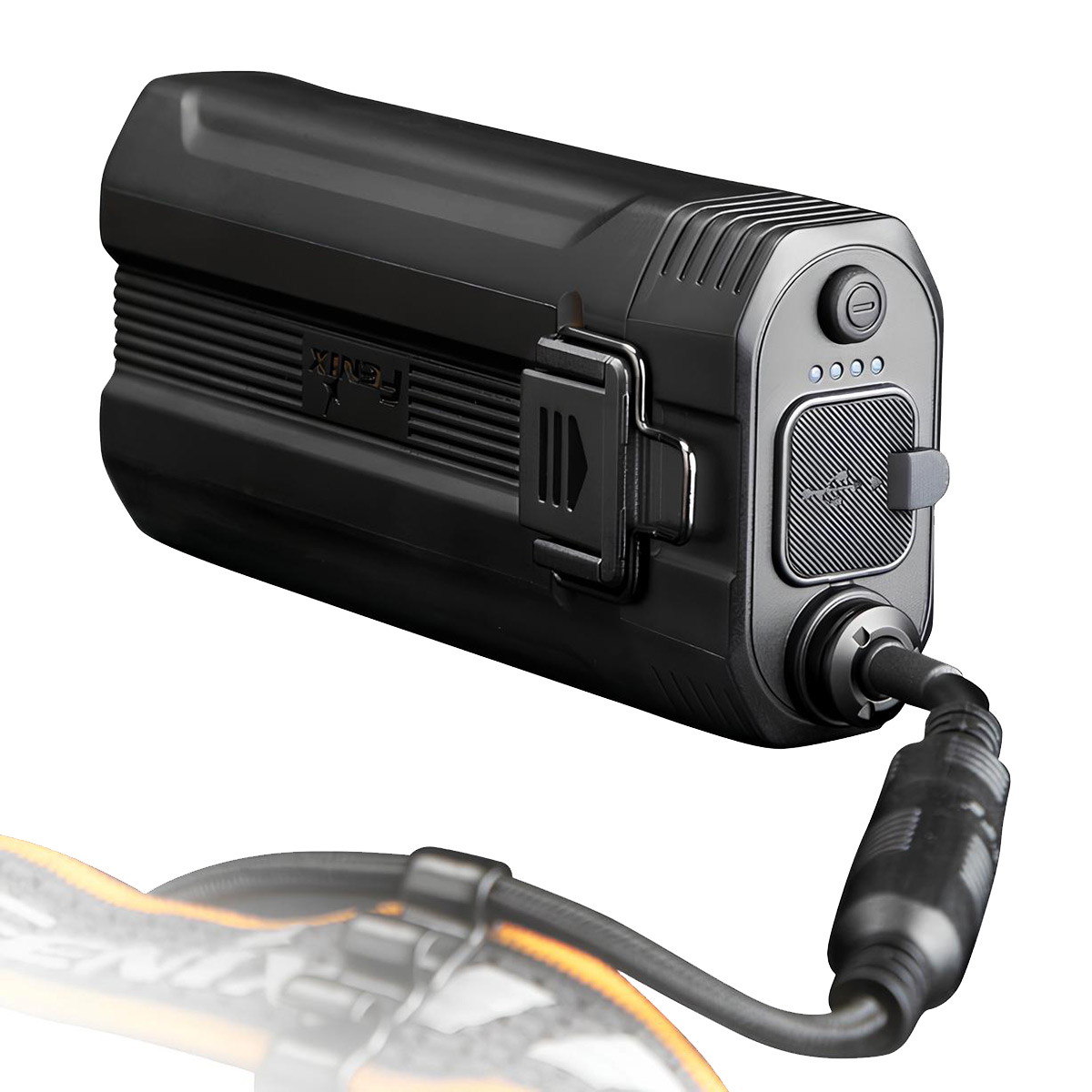 Живлення ліхтаря забезпечується двома акумуляторами типу 21700, а саме фірмовими ARB-L21-5000 ємністю 5000 мАг кожен. Роздільна конструкція ліхтаря та батарейного блоку забезпечує максимальну зручність: футляр з акумуляторами можна носити позаду на ремінці, на поясі, розмістити в кишені чи рюкзаку. Акумулятори заряджаються через порт USB Type-C за допомогою комплектного кабелю, що забезпечує швидку зарядку за 4.5 години. Функція повербанку дозволяє також заряджати інші ваші гаджети. Щоб перевірити поточний стан заряду, натисніть кнопку керування при вимкненому ліхтарі, після чого індикатор загориться на 3 секунди.