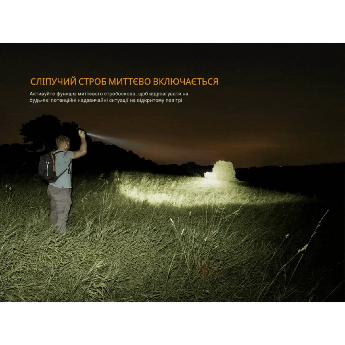 Система живлення ліхтаря відповідає його високому технологічному рівню. В основі лежить сучасний та місткий літій-іонний акумулятор формату 21700, причому фірмовий елемент Fenix ARB-L21-5000 V2.0 вже входить до комплекту постачання. Цей акумулятор забезпечує тривалий час роботи, який у мінімальному режимі досягає 65 годин. Зарядка відбувається швидко та зручно через вбудований порт USB Type-C, що дозволяє поповнювати енергію від будь-якого сумісного джерела: мережевого адаптера, павербанка чи ноутбука. Попри свою потужність та міцний металевий корпус, вага ліхтаря становить всього 302 грами (включно з акумулятором), це робить його комфортним для тривалого носіння та використання.