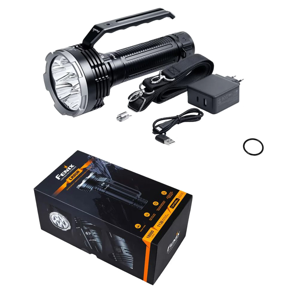 Fenix LR80R (18 000 Лм) — це надпотужний ліхтар для проведення пошуково-рятувальних операцій. Модель обладнана шістьма світлодіодами Luminus SST70, які генерують дуже яскравий світловий потік у 18 000 люмен. Дальність світлового променя досягає 1130 м, що є більше 1 км. Завдяки таким характеристикам, навіть в умовах сильної темряви можна легко виявити потрібний об’єкт.