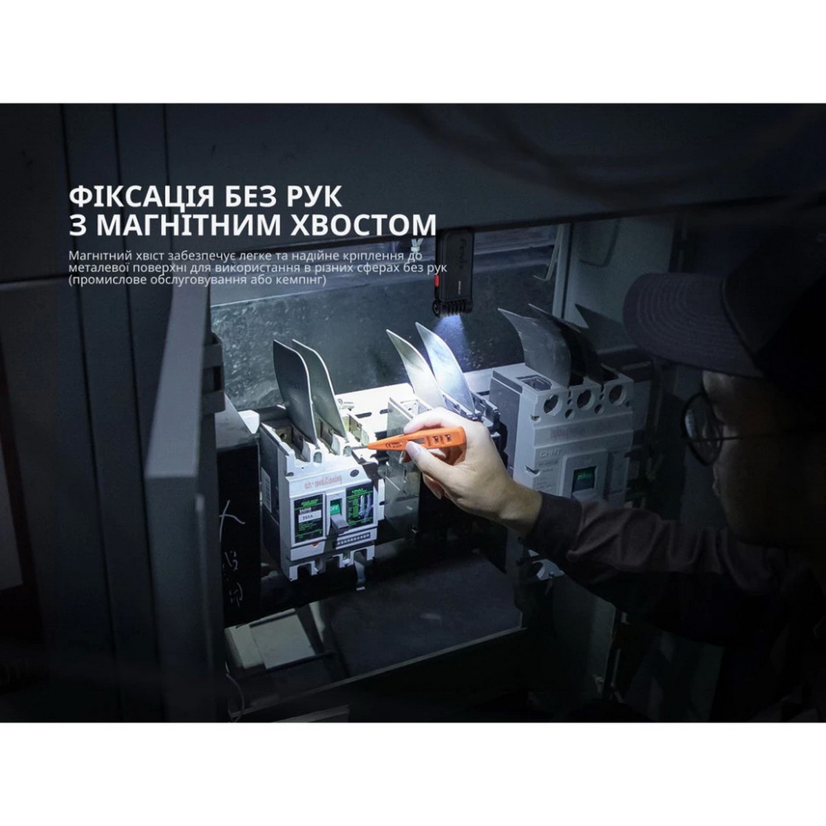 Живлення забезпечує вбудований акумулятор на 700 мАг, здатний підтримувати роботу до 62 годин у мінімальних режимах. Заряджання здійснюється через порт USB Type-C, що надає змогу швидко поповнити запас енергії будь-де. Завдяки вазі лише 55 грамів ліхтар практично не відчувається під час носіння. Для підвищення зручності він оснащений подвійним кліпсом для кріплення на одяг, спорядження або ремінь, а магніт у хвостовій частині дозволяє закріпити його на металевих поверхнях та звільнити руки під час роботи.