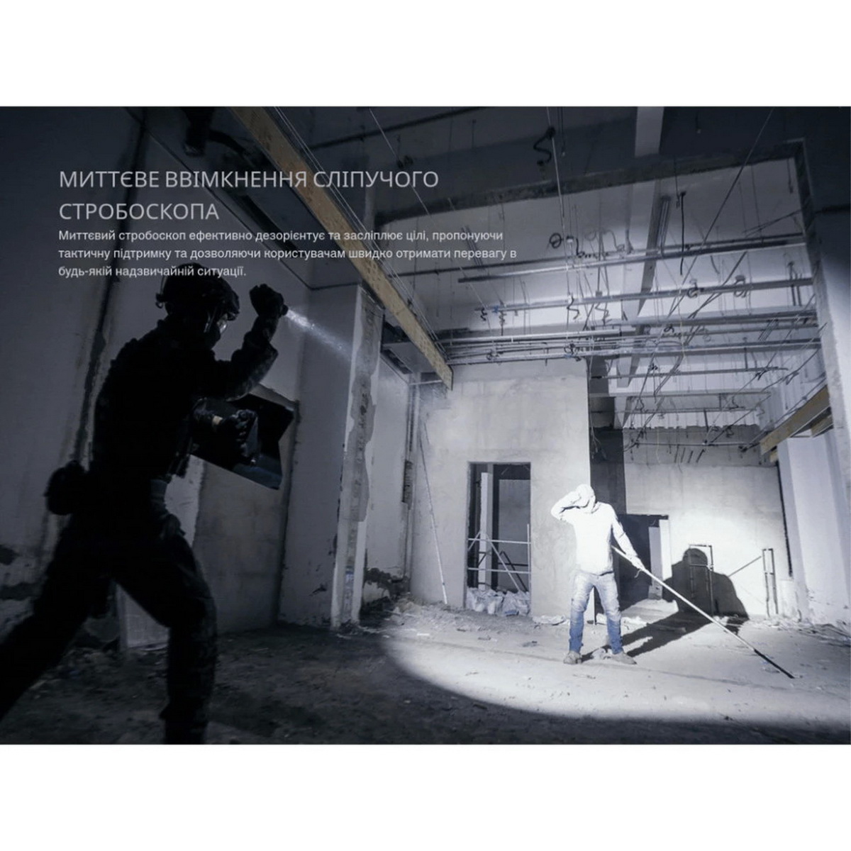 Керування здійснюється за допомогою двох кнопок, розташованих у торцевій частині корпусу, що дозволяє впевнено оперувати пристроєм тактичним хватом. Користувачеві доступні 4 режими постійної яскравості для різних сценаріїв використання, а також режим Strobe зі змінною частотою мерехтіння для дезорієнтації супротивника. Важливою особливістю є вбудована інтелектуальна схема захисту від перегрівання, яка контролює температуру діода і корпусу при роботі на високих потужностях. Для зручності моніторингу стану батареї передбачено інтуїтивний світловий індикатор заряду, який дозволяє заздалегідь планувати час роботи та уникати несподіваних відключень.