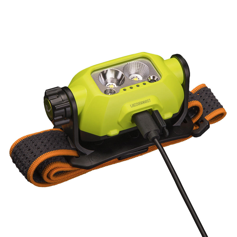 Цей налобний ліхтар обладнаний вбудованим акумулятором ємністю 2000 мАг. Зарядка акумулятора здійснюється через порт USB Type-C за допомогою комплектного кабелю, що що забезпечує швидку зарядку за 1.5 години. Завдяки вбудованому індикатору можна перевіряти рівень заряду: чотири сині лампочки вказують на рівень 100-80%, три – 80-60%, дві – 60-40%, одна – 40-20%, один миготлива – менше 20%.