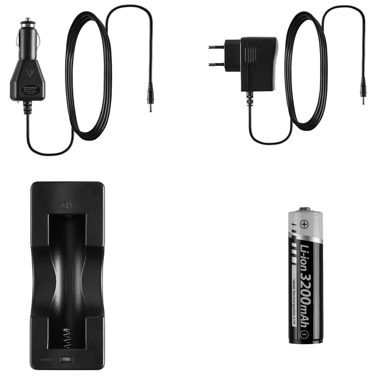 Акумулятор Li-ion 18650 ємністю 3200 мАг забезпечує більше 23 годин безперервної роботи в економному режимі. В комплекті постачання присутні зарядні пристрої для заряджання як від побутової електромережі, так і від бортової електромережі автомобілів.