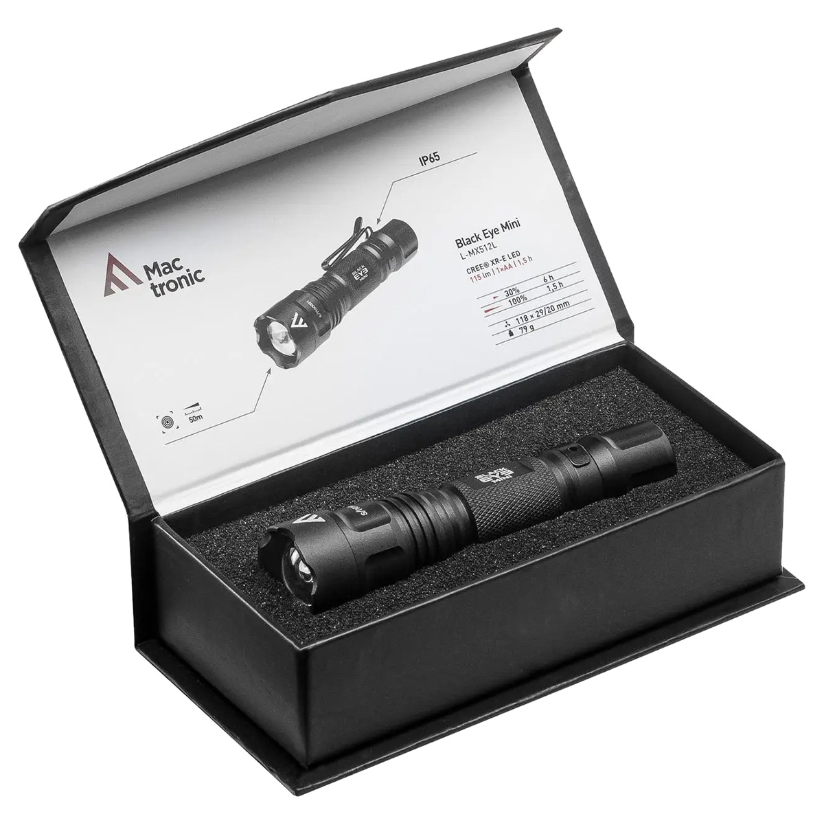 Mactronic Black Eye Mini (135 Лм) — найбільш компактний тактичний ліхтар із серії Black Eye. Модель вирізняється наявністю системи фокусування променя (висувна лінза). Добре підходить для використання в екстремальних умовах (тактичні операції, туризм, мисливство) і для повсякденного користування. Поставляється в подарунковій упаковці з магнітним замком.