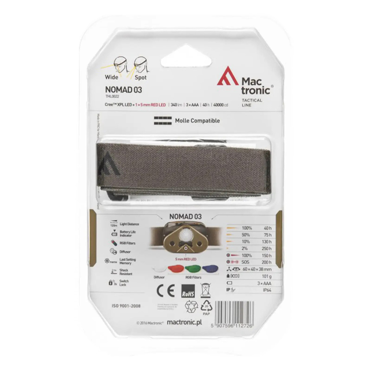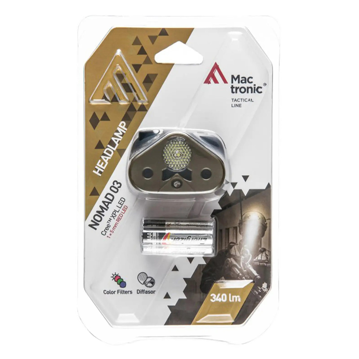 Mactronic Nomad 03 RGB Kit (340 Лм) — налобний тактичний ліхтар, що вирізняється потужністю, далекобійністю, наявністю у комплекті світлових фільтрів (R – червоний, G – зелений, B – синій) та прозорого дифузора, а також можливістю установки в гніздо для ПНБ на касці або на стропі MOLLE. Чудово підходить для працівників охоронних та силових структур, мисливців, туристів, відповідає встановленим вимогам для нічних стрибків із парашутом.