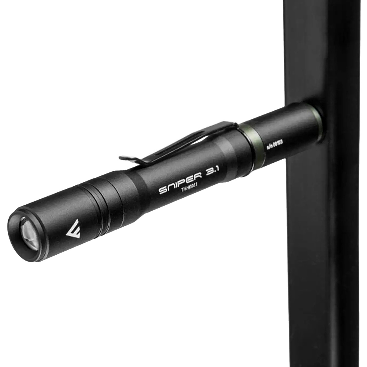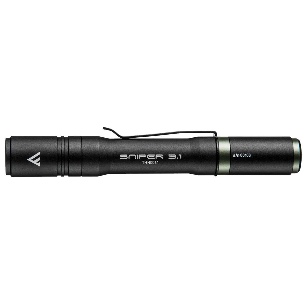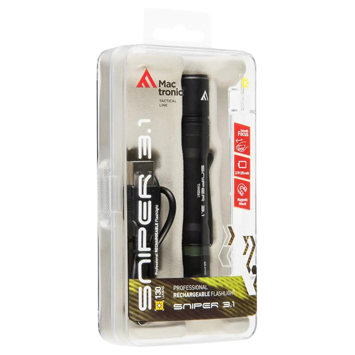 Mactronic Sniper 3.1 (130 Лм) — компактний та надійний ліхтар, який відмінно підходить для вирішення тактичних завдань військовими і спецпідрозділами, туризму, ремонтних майстерень, перевірки документів тощо. Прилад оснащений висувною лінзою (система фокусування) для ручного регулювання кута променя від вузького до широкого, що безпосередньо впливає на дальність світлового потоку. Завдяки цьому дана модель однаково добре впорається з освітленням території на відстані до 37 метрів та поруч із користувачем.