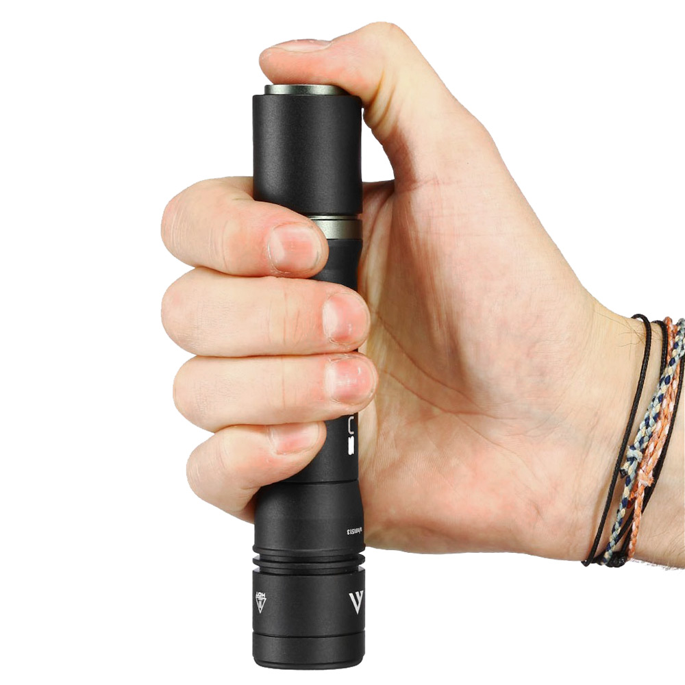 - Фокусування регулюється ковзанням голови ліхтаря та може здійснюватися за допомогою лише одного великого пальця руки