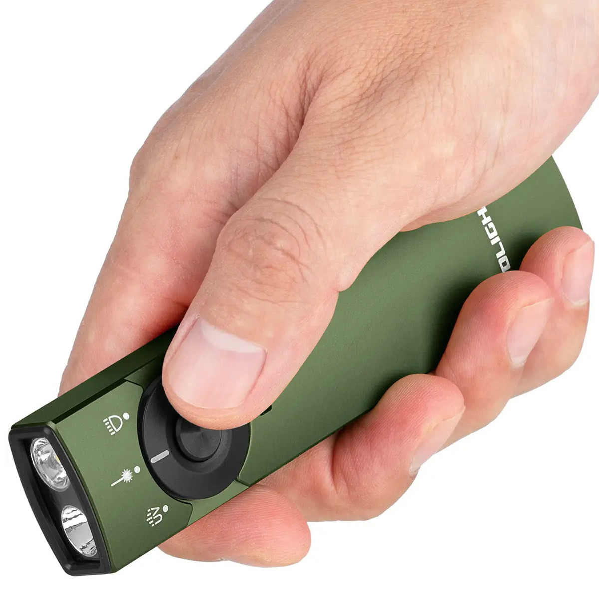 Ліхтар Olight Arkfeld Pro Class 1 CW OD Green — це багатофункціональний освітлювальний інструмент, який поєднує в собі компактність, потужність і надійність. Він розроблений для щоденного використання, подорожей, професійних завдань та спеціалізованих ситуацій, де потрібне УФ-освітлення чи лазер. Оснащений білим High-Performance LED світлодіодом і TIR-оптикою, ліхтар генерує світловий потік до 1300 люменів, що забезпечує впевнене освітлення простору навіть у найтемніших умовах. Максимальна дистанція дії променя становить 102 метри, роблячи модель універсальною як для ближніх, так і для середніх відстаней. Холодне світло дозволяє чітко розпізнавати деталі, створюючи яскраве й рівномірне освітлення без спотворень кольорів.