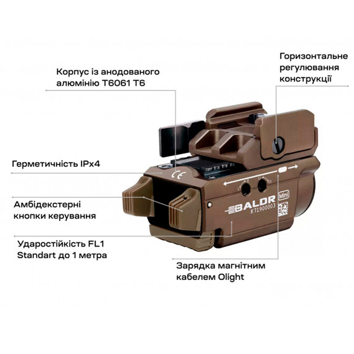 ˳õòàð Olight Baldr Mini — êîìïàêòíèé òàêòè÷íèé ïðèëàä, ùî ïîºäíóº òåõíîëî㳿 òà ïðàêòè÷íó ôóíêö³îíàëüí³ñòü äëÿ ñó÷àñíîãî ñòð³ëüöÿ. Ïðèñòð³é ïðèçíà÷åíèé äëÿ êð³ïëåííÿ ÿê íà êîðîòêîñòâîëüíó, òàê ³ íà äîâãîñòâîëüíó çáðîþ, çàáåçïå÷óþ÷è çíà÷íó ïåðåâàãó â óìîâàõ ïîãàíî¿ âèäèìîñò³.