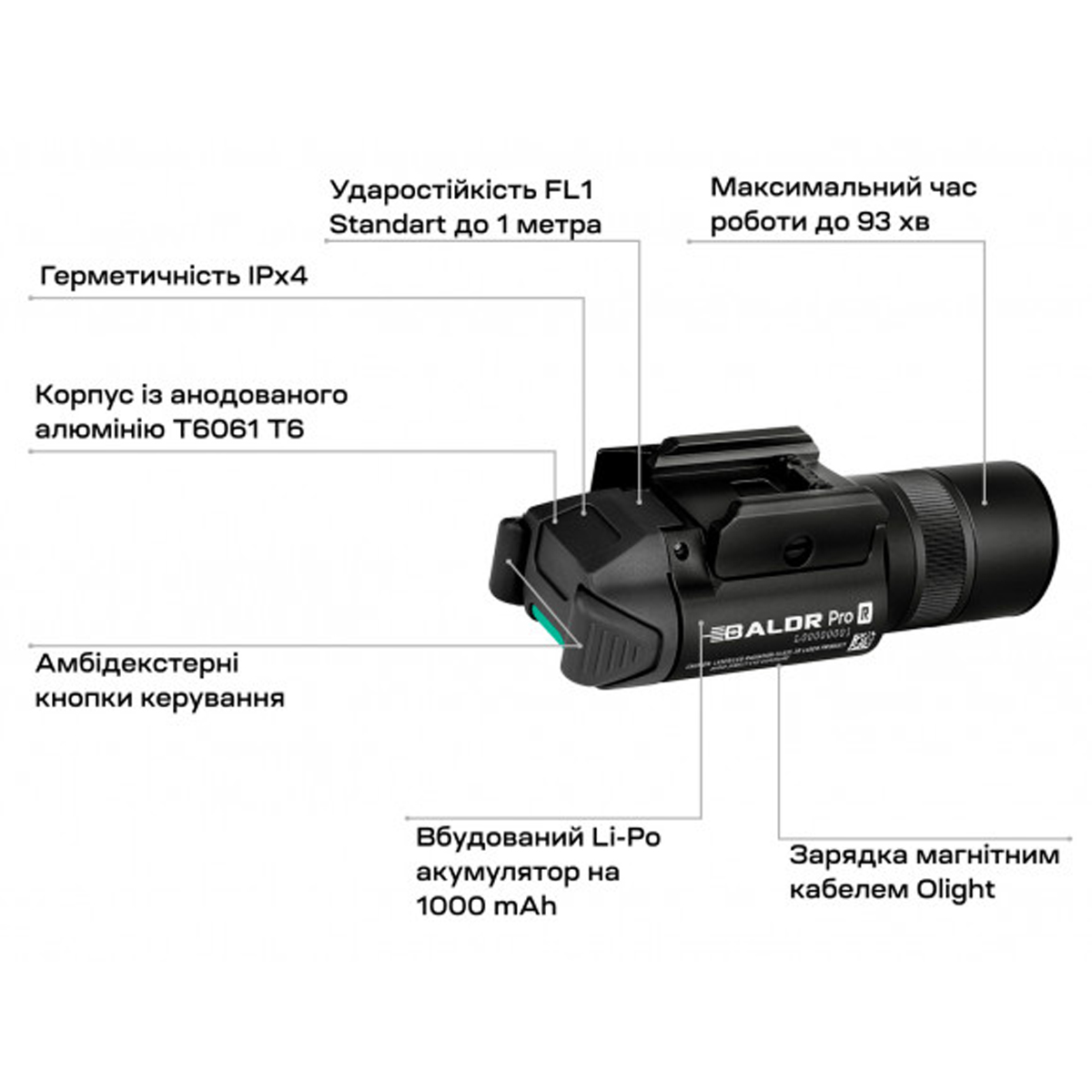 Baldr Pro R пропонує набір зручних тактичних режимів: два основні рівні яскравості — 1350 і 300 люменів, а також режим Strob для тимчасової дезорієнтації противника. Керування реалізовано через дві симетричні кнопки на тильній частині корпусу, що дозволяє миттєво активувати світло та лазер як правшам, так і лівшам. Одна з важливих особливостей моделі — магнітне кільце-селектор на головній частині приладу, яке легким поворотом дозволяє вибирати режим роботи: тільки ліхтар, тільки лазер або їх комбіновану роботу. Для зручності експлуатації передбачена можливість заряджати акумулятор безпосередньо через магнітний порт, роблячи процес поповнення енергії швидким та надійним.
