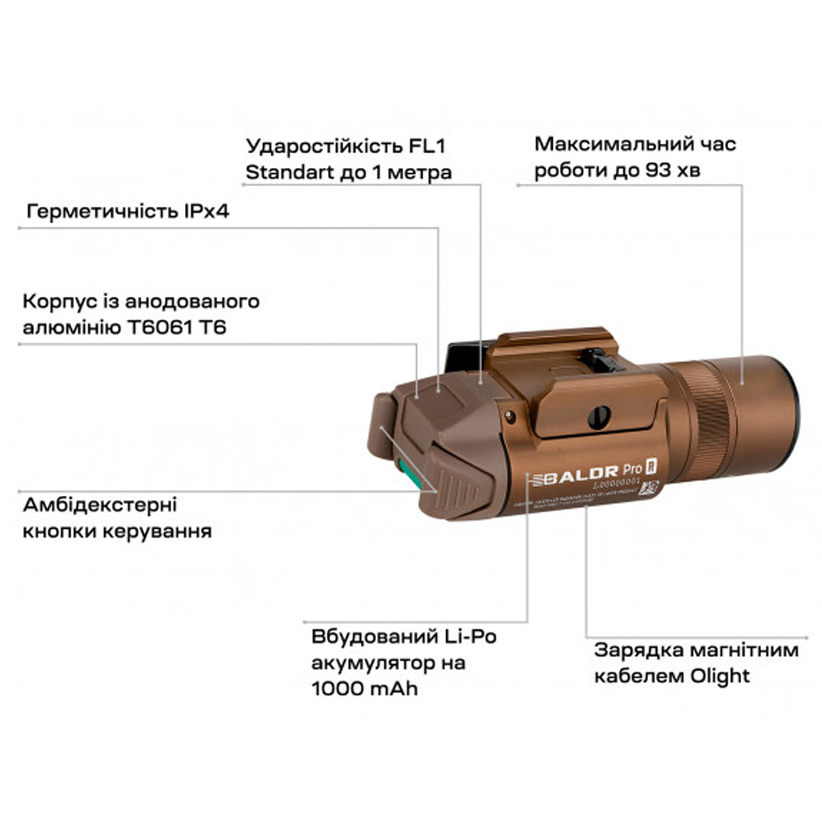 Функціонал ліхтаря пропонує два основні режими яскравості (1350 та 300 люменів), дозволяючи адаптувати освітлення до конкретної тактичної ситуації, а також режим "Strob" для дезорієнтації супротивника. Керування пристроєм здійснюється двома симетричними кнопками, розташовані в задній частині корпусу, забезпечують миттєву активацію світла та ЛЦВ як для правші, так і для лівші. Особливістю моделі Baldr Pro R є магнітне кільце-селектор, розташоване на головній частині. Легким поворотом цього кільця користувач може заздалегідь обрати бажаний режим: тільки ліхтар, тільки ЛЦВ або комбінований режим ліхтаря та ЛЦВ. Можливість підзарядки напряму через магнітний порт робить процес відновлення енергії максимально швидким та зручним.