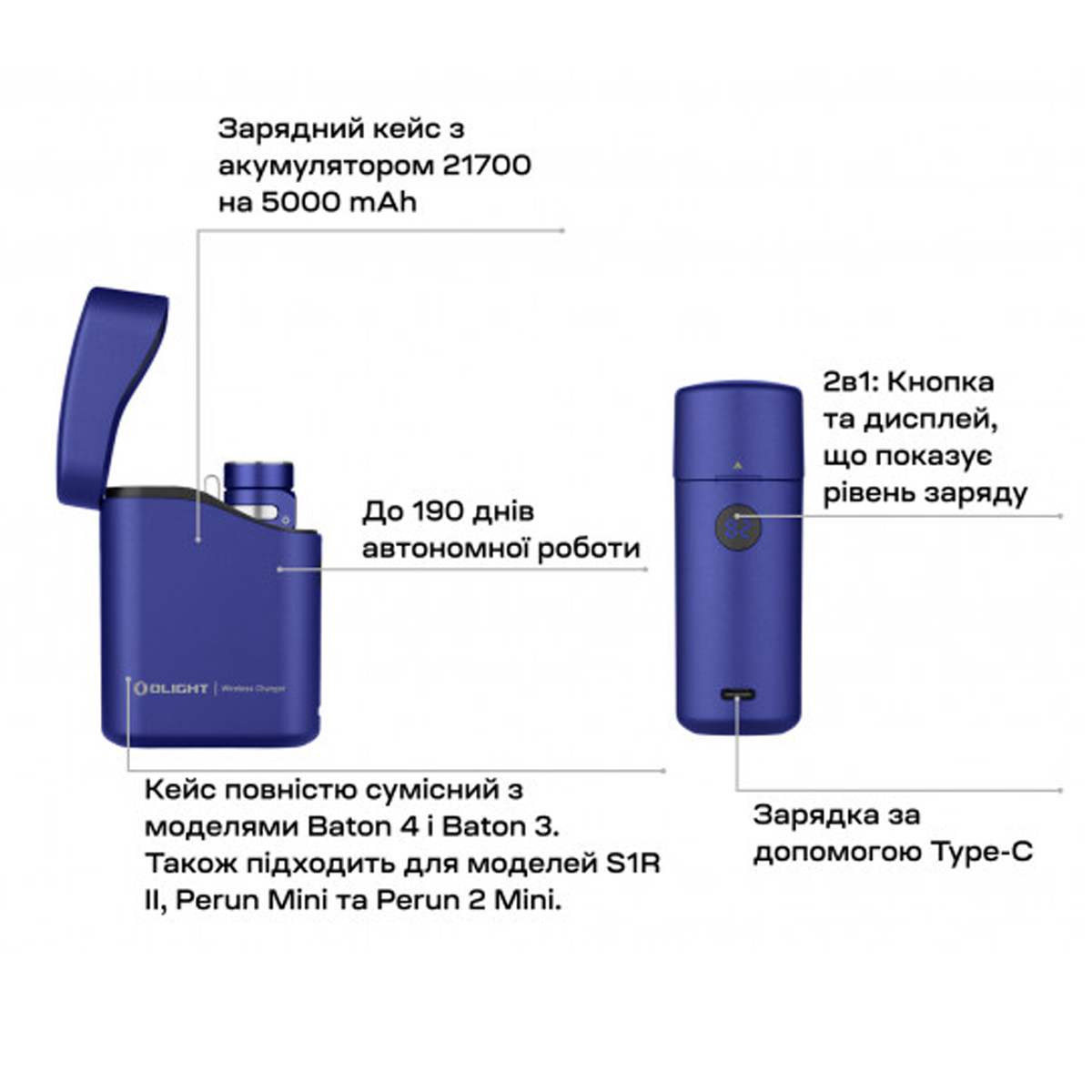- Індикатор зарядки на ліхтарі та на кейсі