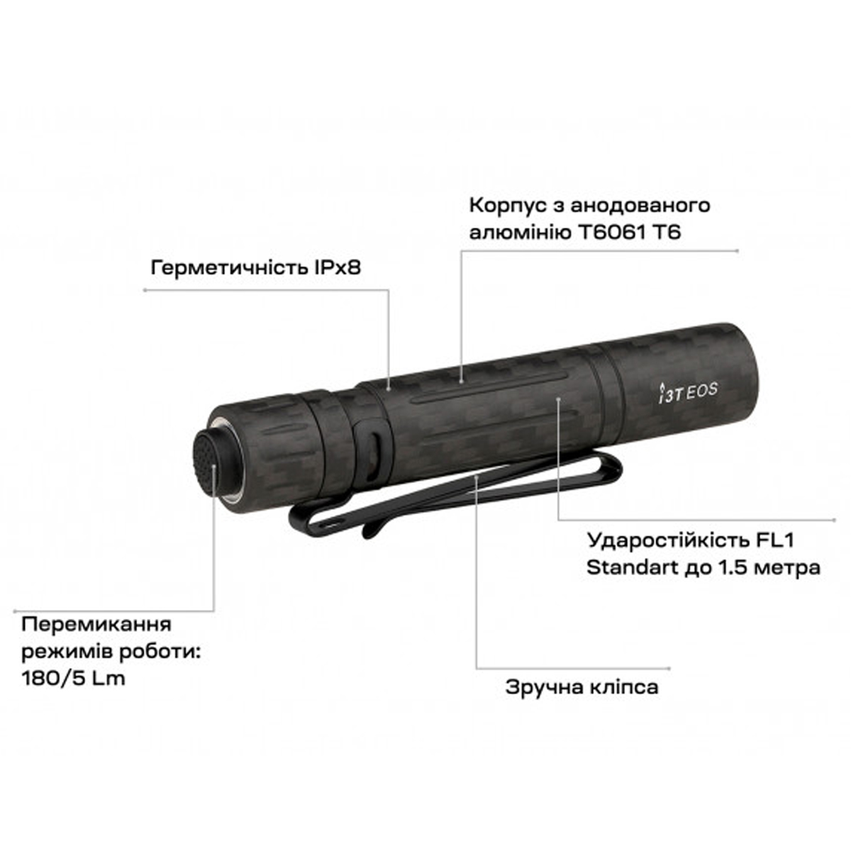 Olight I3T EOS Carbon Fiber — це гармонійне поєднання компактності, функціональності та надійності. Він стане надійним помічником для тих, хто цінує практичність, якісне освітлення та універсальність у повсякденному житті, подорожах або в роботі на природі, гарантуючи стабільну яскравість та комфорт за будь-яких умов.