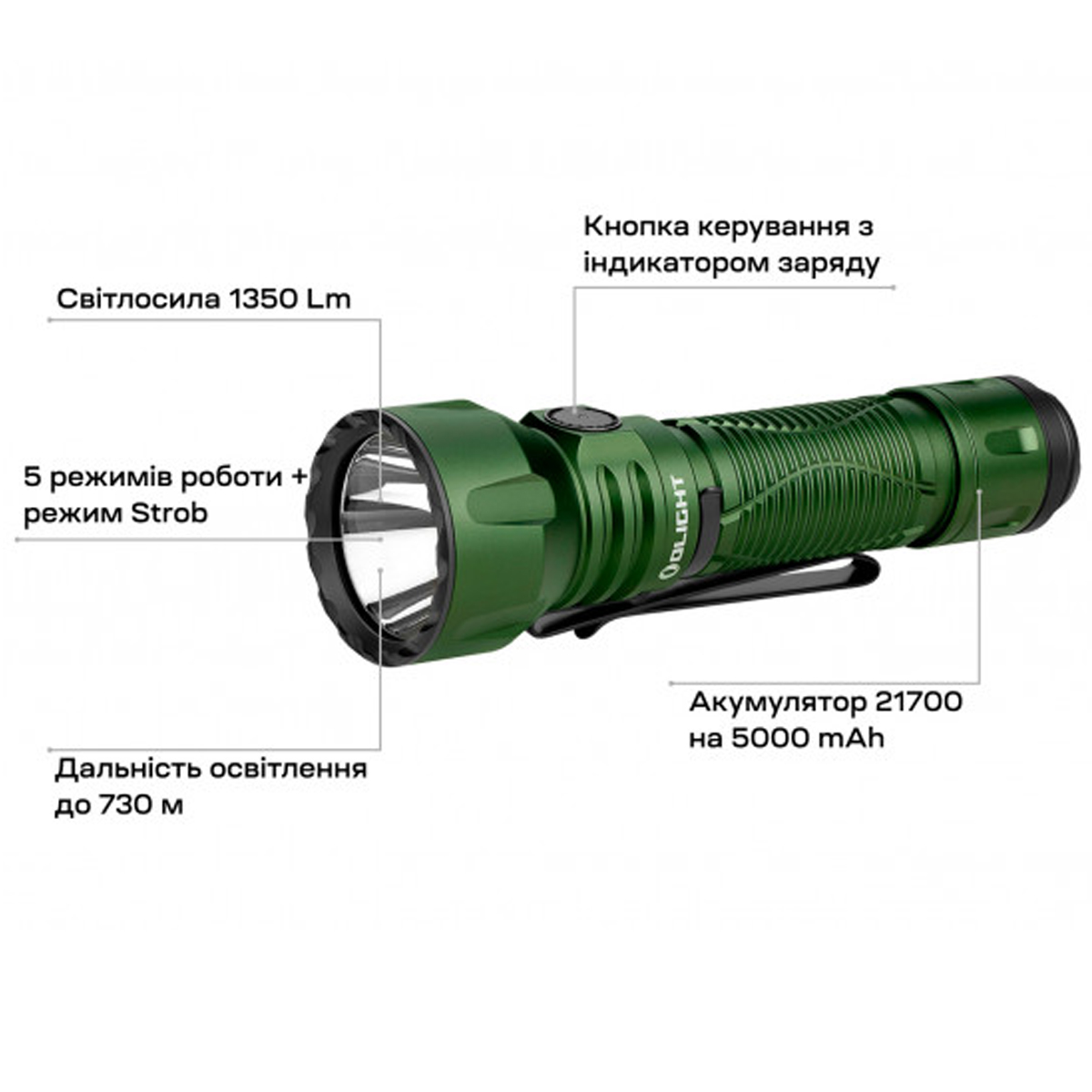 За живлення відповідає місткий літій-іонний акумулятор формату 21700 на 5000 мАг, який гарантує стабільну та тривалу роботу. Попри свої технічні можливості, модель залишається компактною: довжина становить лише 138 мм, а вага — 200 г, це робить її зручною для щоденного носіння в рюкзаку чи кишені. У комплекті йде сучасний магнітний зарядний кабель Olight MCC3 USB. Для зручності транспортування передбачена двостороння сталева кліпса, яка легко кріпиться на пояс, кишеню або елементи спорядження, забезпечуючи швидкий доступ до пристрою.