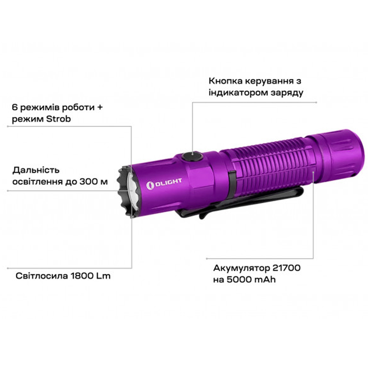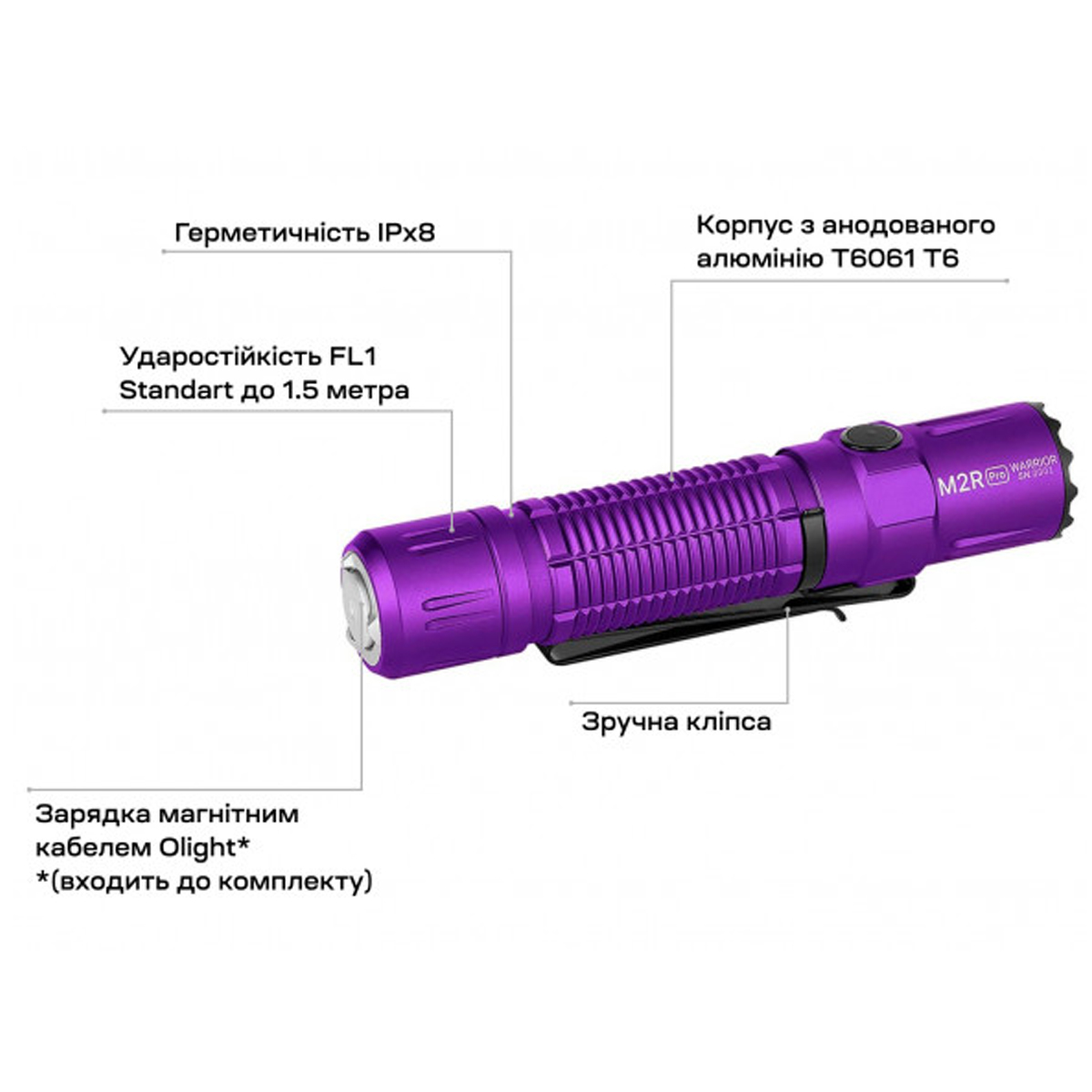 Olight M2R Pro Purple — це потужний ручний ліхтар, розроблений для використання в складних умовах і професійних завданнях. Це чудове рішення для працівників правоохоронних органів, рятувальників, мисливців та тих, хто потребує надійного інструменту для роботи в екстремальних умовах.