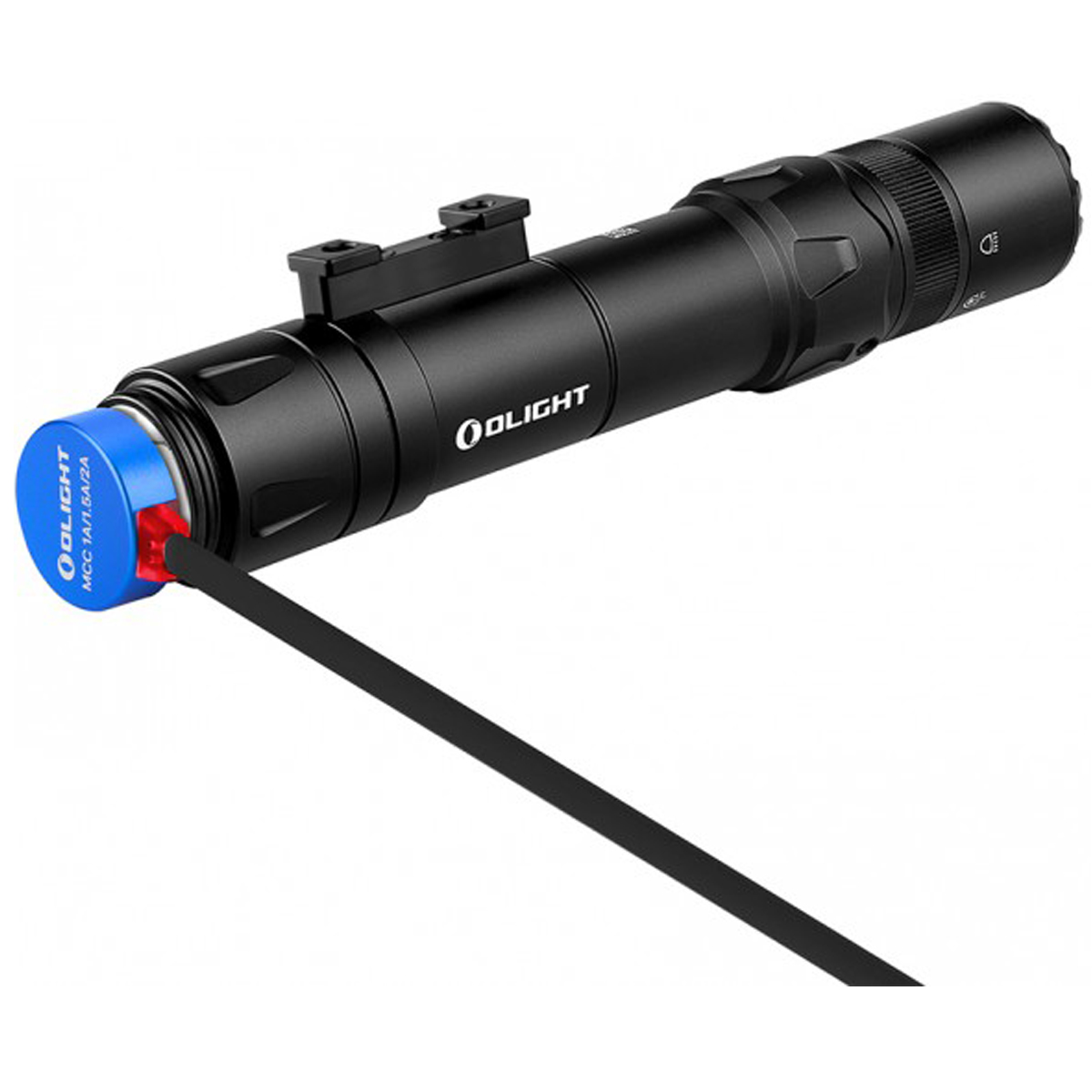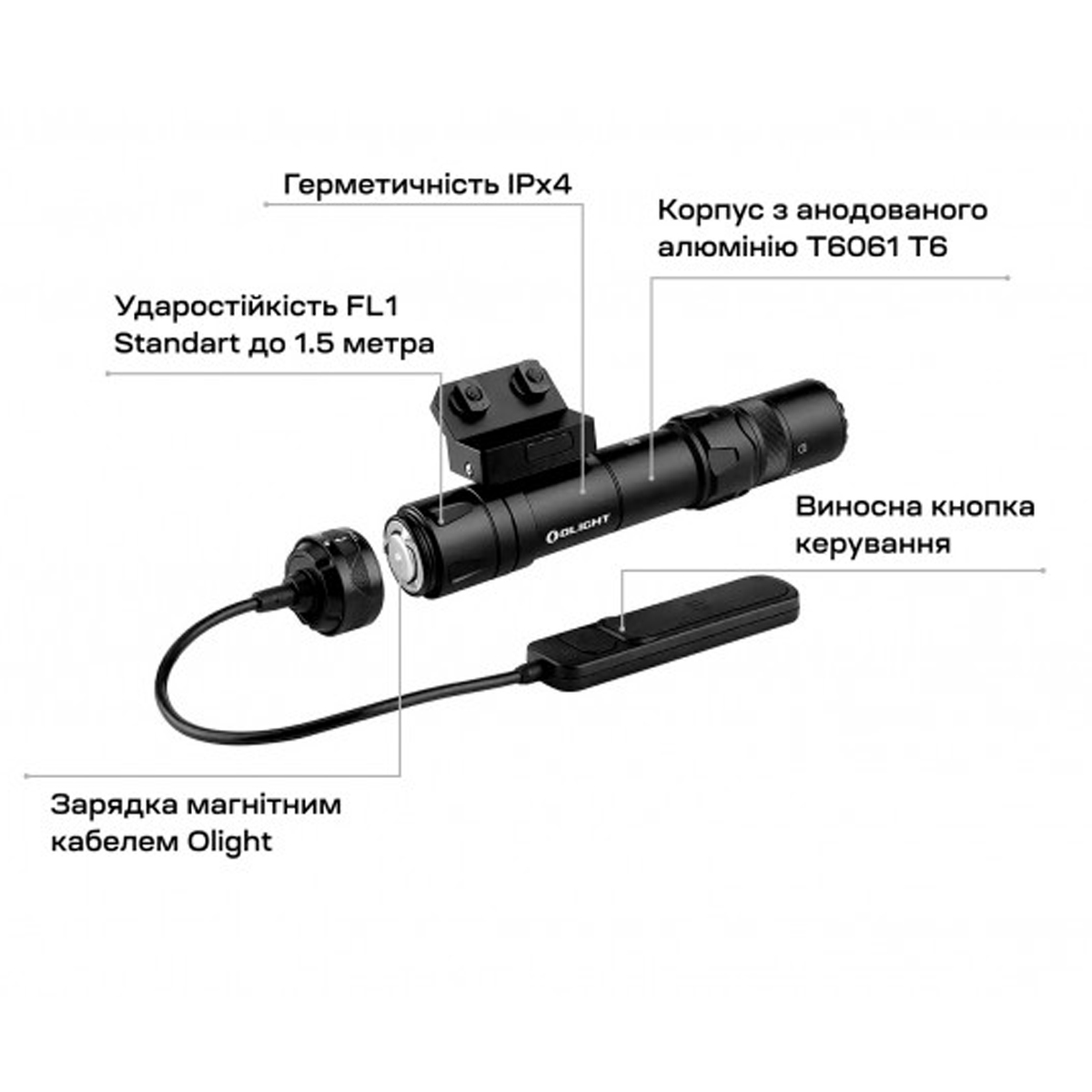 Джерелом живлення слугує акумулятор формату 21700 на 5000 мАг, що забезпечує тривалий час роботи — до 6.5 годин у режимі мінімальної яскравості. При вазі всього 224 грами та довжині 149 мм ліхтар не вносить суттєвого дисбалансу у зброю. Процес зарядки реалізований за допомогою фірмової магнітної технології Olight: зарядний кабель з USB-конектором миттєво приєднується до торцевої кришки, роблячи процес максимально швидким та зручним. Ця ж торцева кришка слугує і для під'єднання виносної кнопки.