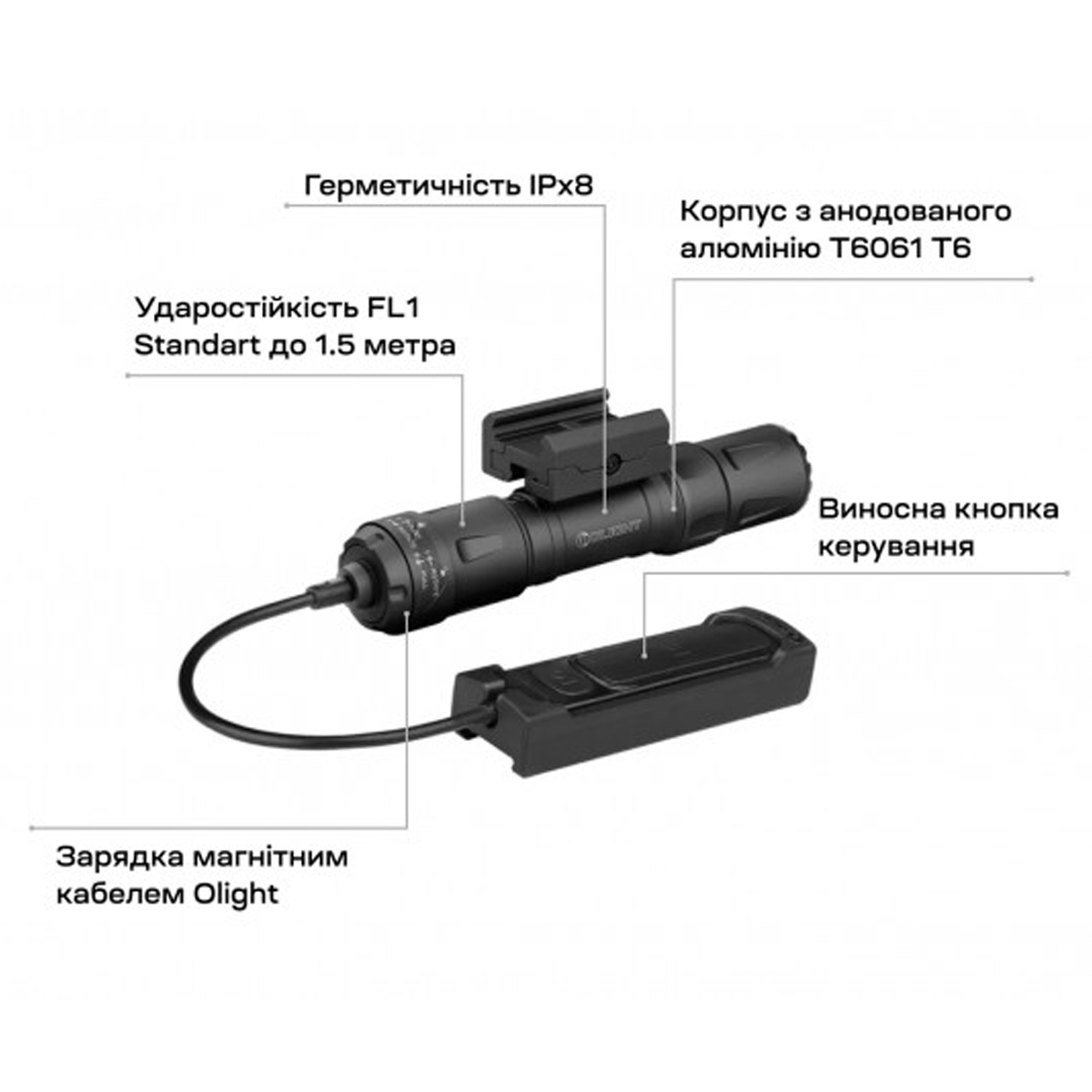 Ліхтар підтримує два рівні яскравості та додатковий тактичний режим Strob, який використовується для дезорієнтації супротивника. Управління здійснюється через торцеву безшумну кнопку з двоступеневим натисканням: легке натискання активує менш інтенсивний режим, тоді як повне забезпечує миттєвий вихід на максимальну потужність. У комплект входить надійне кріплення, сумісне зі стандартом M-LOK, що дає можливість швидко й міцно зафіксувати ліхтар на зброї. Для ще більшої зручності користувач отримує виносну магнітну кнопку дистанційного керування із замком, яка дозволяє вмикати світло, не змінюючи положення рук та не втрачаючи точності прицілювання.