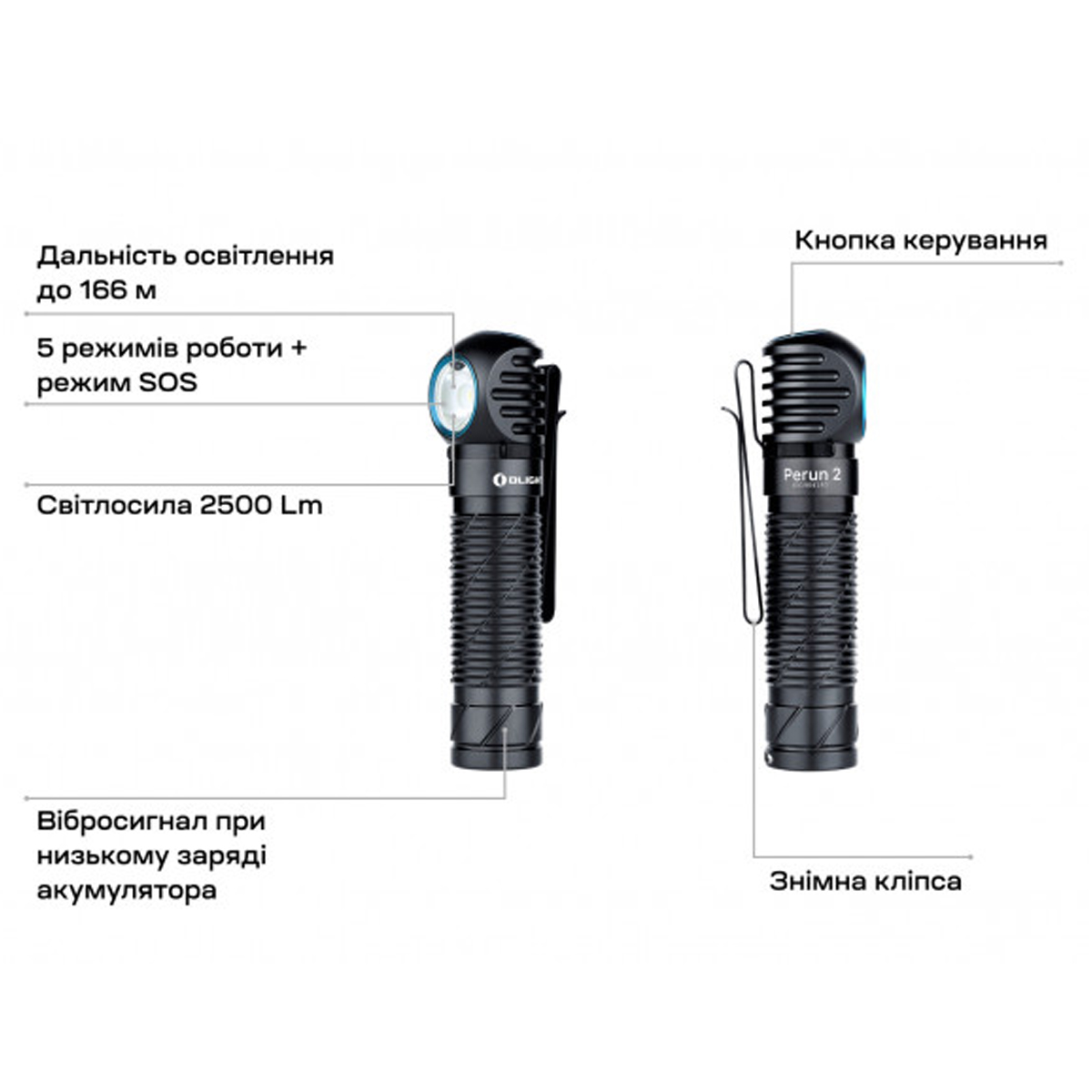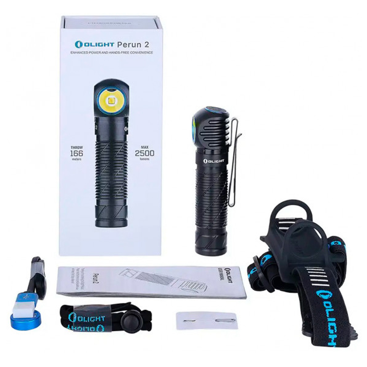 Г-подібний ліхтар Olight Perun 2 – це високопродуктивний прилад, призначений для туризму, активного відпочинку, професійної діяльності та повсякденного використання. В основі його потужності лежить сучасний світлодіод білого світла Cree XH-P 50 CW, що генерує світловий потік у 2500 люменів. Такий інтенсивний промінь здатний освітлювати об'єкти на відстані до 166 метрів. Завдяки продуманій оптичній системі, ліхтар забезпечує широке та рівномірне світлове поле, яке ідеально підходить як для огляду великих територій, так і для роботи на близькій відстані, гарантуючи чітку видимість без сліпих зон.