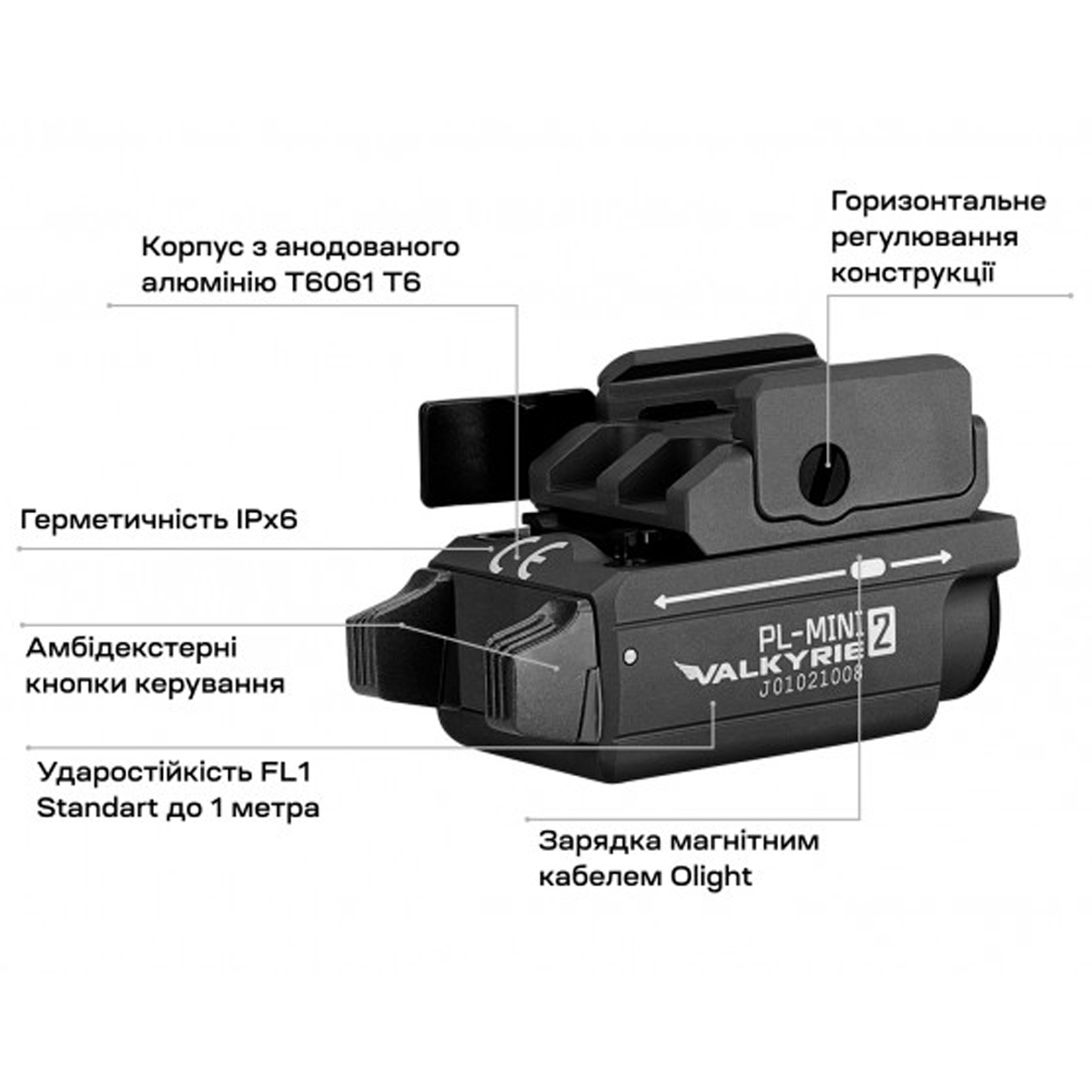 Olight PL-Mini 2 Valkyrie є ультракомпактним підствольним ліхтарем, який поєднує чудову яскравість, систему кріплення з можливістю регулювання, міцність та зручність магнітної зарядки. Це робить його найкращим вибором для власників пістолетів та карабінів, які шукають легке, надійне та потужне джерело тактичного світла.