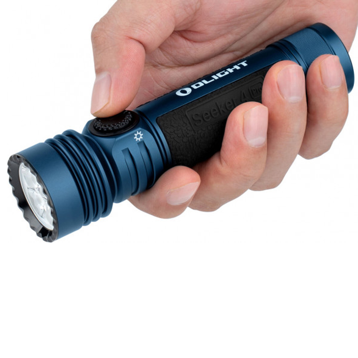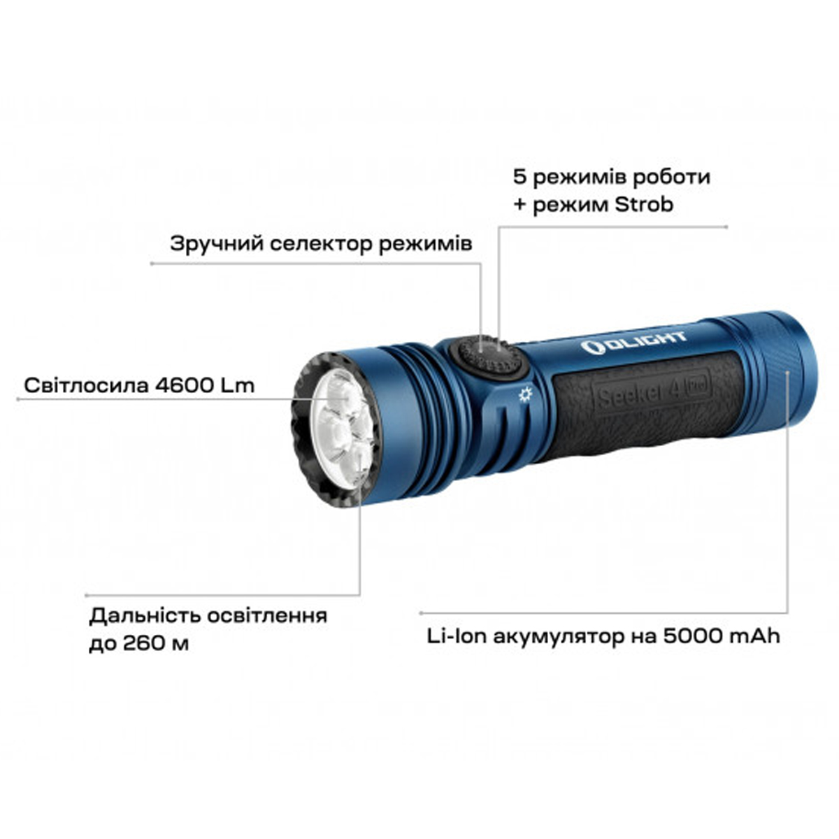 Ліхтар Olight Seeker 4 Pro — це якісний та професійний освітлювальний прилад, створений для користувачів, яким потрібна максимальна ефективність у складних і вимогливих умовах. Він стане надійним інструментом для представників силових структур, рятувальних служб, мисливців, а також любителів активного відпочинку та екстремальних пригод. Оснащений продуктивним світлодіодом High Performance LED, ліхтар забезпечує потужний світловий потік у 4600 люменів, що гарантує відмінну видимість навіть у повній темряві. Завдяки сконцентрованому променю, здатному освітлювати об’єкти на відстані до 260 метрів, користувач отримує змогу чітко розпізнавати деталі та орієнтуватися в будь-яких умовах.