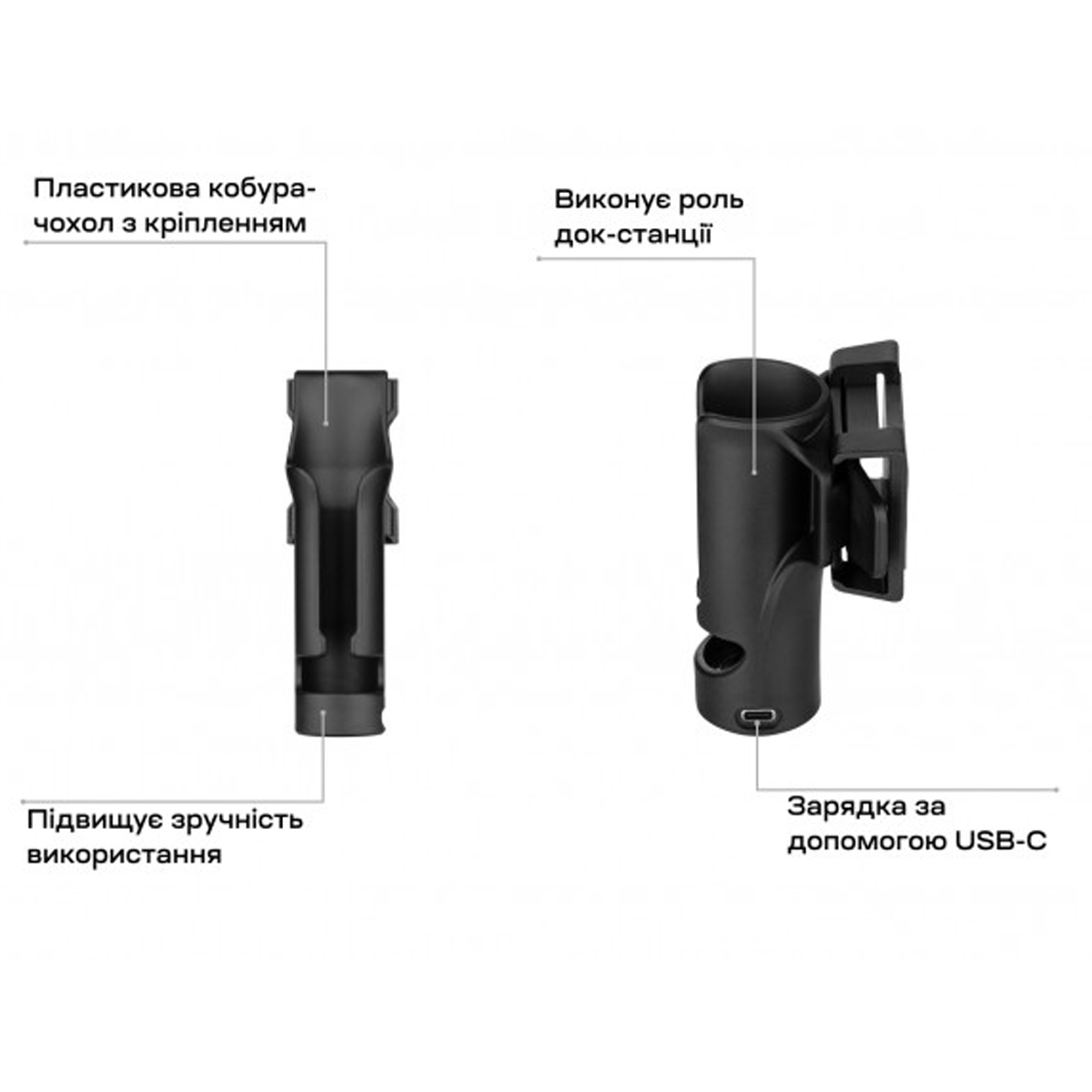 Система керування пристроєм реалізована через металеву бічну кнопку у вигляді поворотного кільця, що дозволяє миттєво перемикати п’ять режимів яскравості або плавно регулювати інтенсивність світла без обмежень. По обидва боки елемента керування розташовані індикатори, які в реальному часі показують рівень заряду акумулятора та поточну яскравість, забезпечуючи повний контроль над роботою ліхтаря. У комплекті також передбачено функціональну пластикову кобуру-чохол, яка одночасно виконує роль зручного тримача і док-станції для заряджання через сучасний порт USB-C. Така конструкція значно спрощує процес відновлення енергії та підвищує зручність використання.