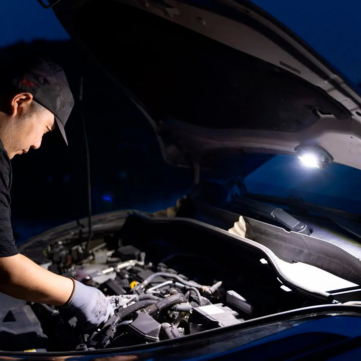 Модель пропонує п’ять режимів яскравості, які дозволяють користувачу вибрати оптимальний рівень освітлення залежно від умов — від економного підсвічування для точних робіт до потужного режиму для повного освітлення робочої зони. Зручне керування за допомогою бічної кнопки забезпечує швидке й інтуїтивне перемикання режимів навіть у рукавичках або в темряві. Конструкція пристрою складається з двох частин: міцного корпусу зі світловим модулем і функціональної підставки-карабіна, яка дає змогу встановити ліхтар під потрібним кутом, закріпити його на гаку чи підвісити для зручної роботи. Потужне магнітне кріплення дозволяє фіксувати пристрій на металевих поверхнях, залишаючи руки вільними.