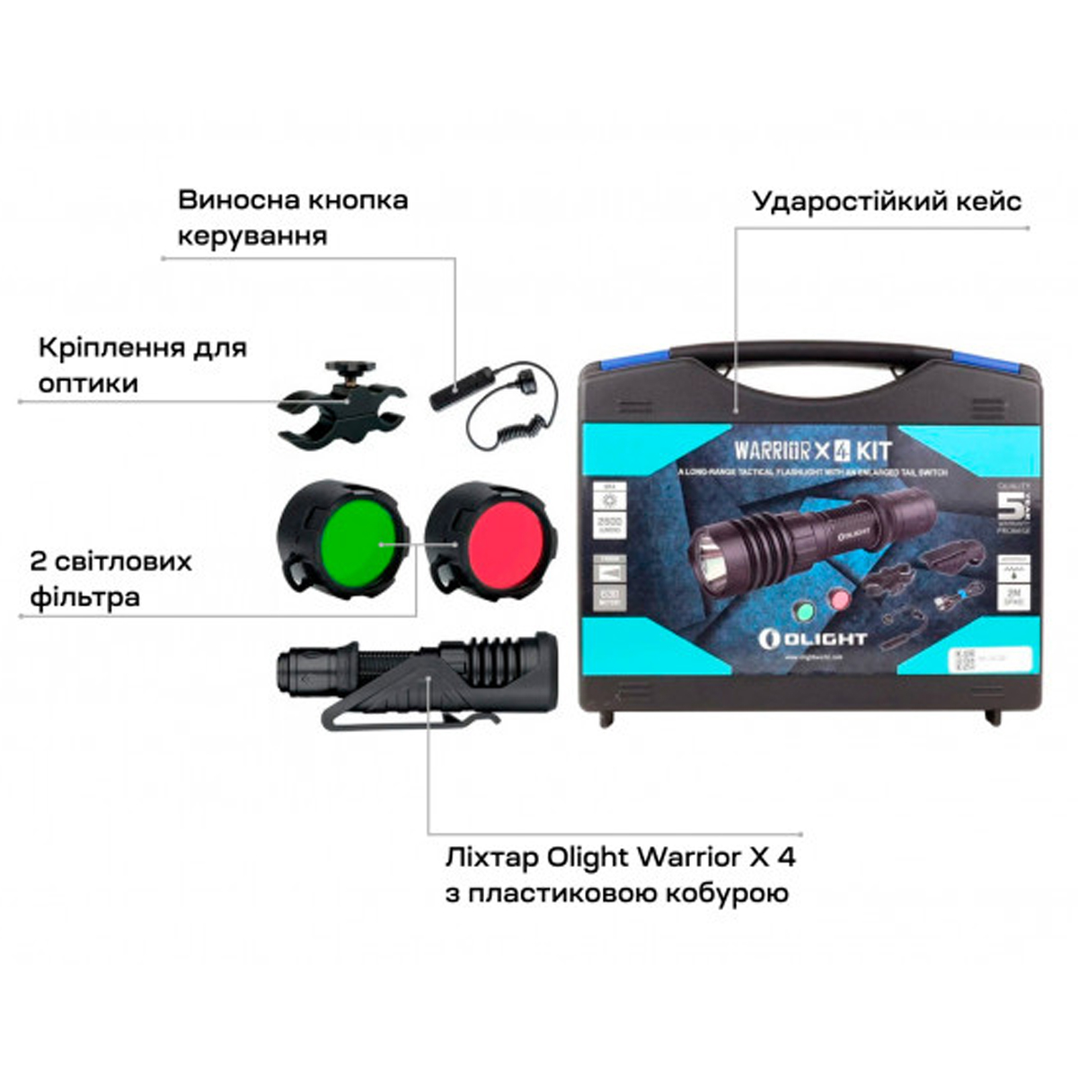 Olight Warrior X 4 KIT – öå áàãàòîôóíêö³îíàëüíèé íàá³ð, ÿêèé ïîºäíàííÿ ïîòóæí³ñòü, äàëåêîá³éí³ñòü, íàä³éí³ñòü òà áàãàòó êîìïëåêòàö³þ, ùî ðîáèòü éîãî ³äåàëüíèì âèáîðîì äëÿ â³éñüêîâèõ, ñï³âðîá³òíèê³â ïðàâîîõîðîííèõ îðãàí³â, ìèñëèâö³â òà ðÿòóâàëüíèê³â, ÿê³ âèñóâàþòü íàéâèù³ âèìîãè äî ñâîãî îáëàäíàííÿ.