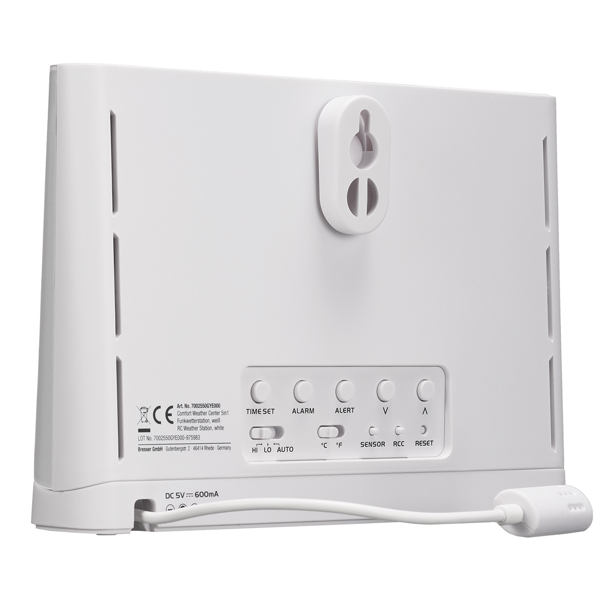 Bresser Weather Center 5-in-1 Comfort White – це нова метеостанція з вуличним датчиком 5-в-1 від німецького бренду Bresser, яка унікальним чином поєднує в собі компактність та багатофункціональність. Метеостанція складається з головного блоку (погодна станція) та мультисенсора (зовнішній датчик), який здатний виміряти швидкість та напрям вітру, рівень опадів, температуру та вологість повітря, а також атмосферний тиск. Встановлення такого датчика не вимагає багато місця та не займає багато часу, оскільки в комплект постачання входить весь необхідний матеріал для монтажу.
