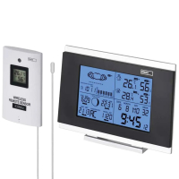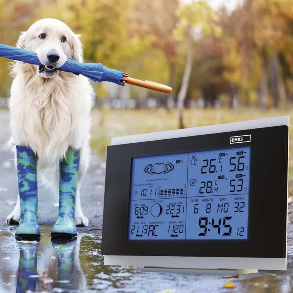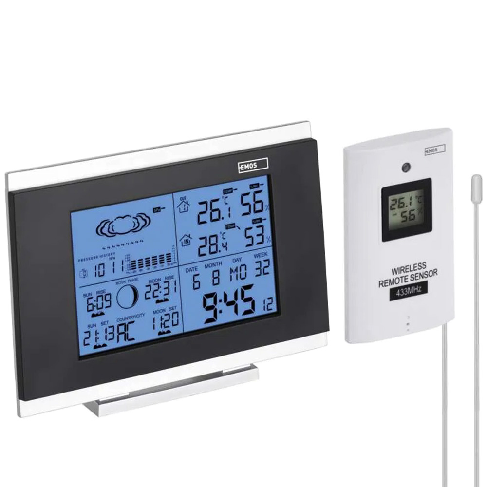 EMOS AOK-5018B – сучасна домашня метеостанція зі зручним монохромним дисплеєм і виносним датчиком з дротовим сенсором. Прилад стане надійним помічником у щоденному моніторингу погодних умов, природних ритмів та мікроклімату в приміщенні, а також виконуватиме практичні функції годинника, будильника й календаря.