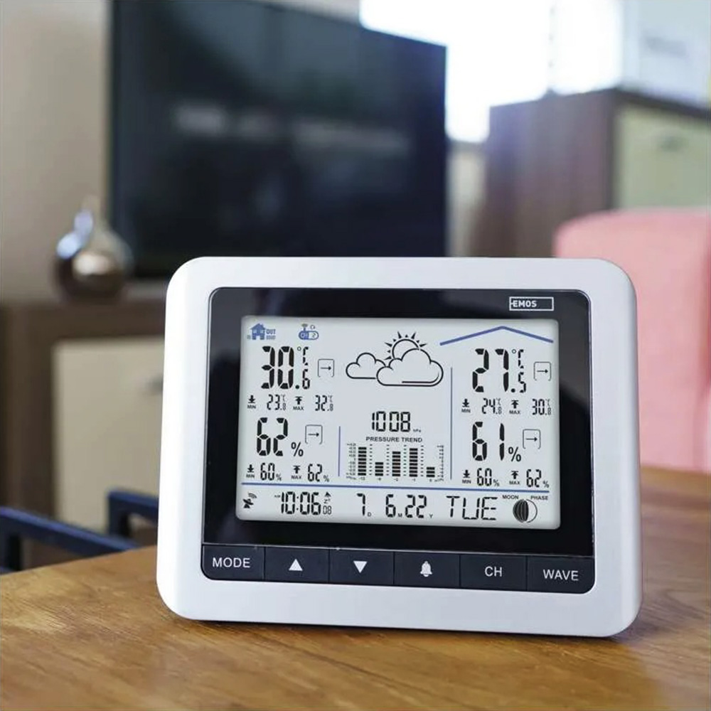 EMOS E0316 – цифрова метеостанція з інформативним монохромним дисплеєм, яка допомагає завжди бути в курсі актуальних погодних умов і контролювати мікроклімат у приміщенні. Вона також виконує практичні функції годинника, будильника та календаря, поєднуючи можливості кількох приладів в одному корпусі.