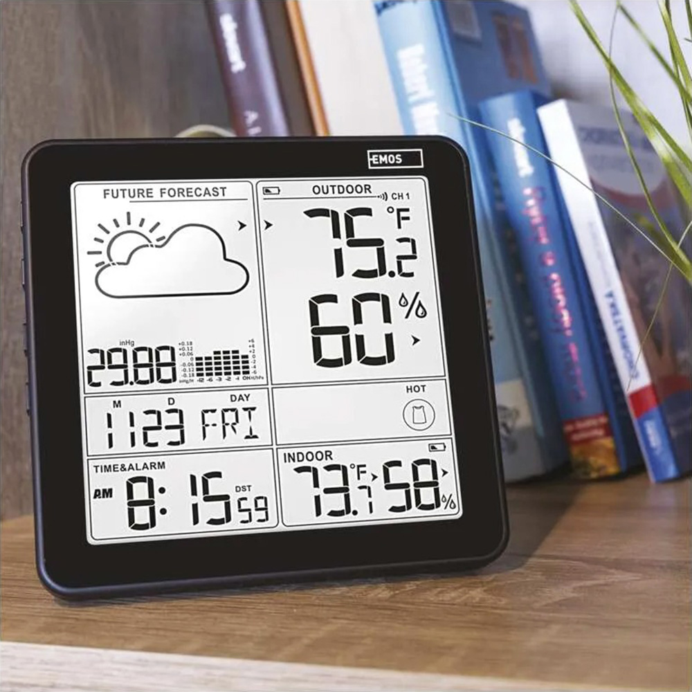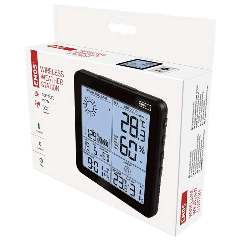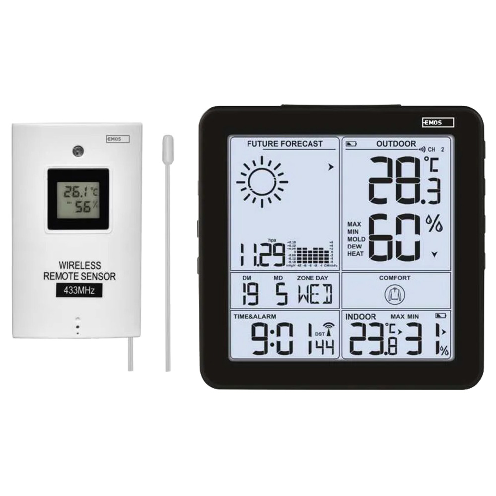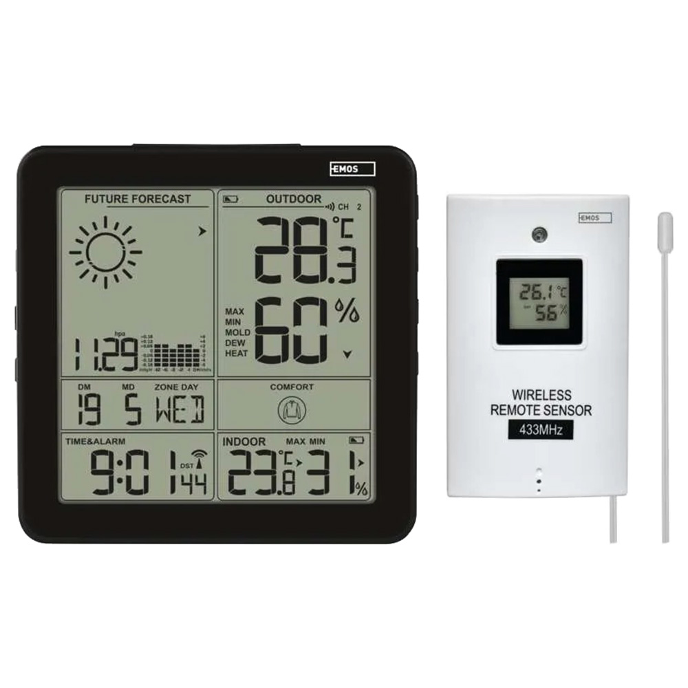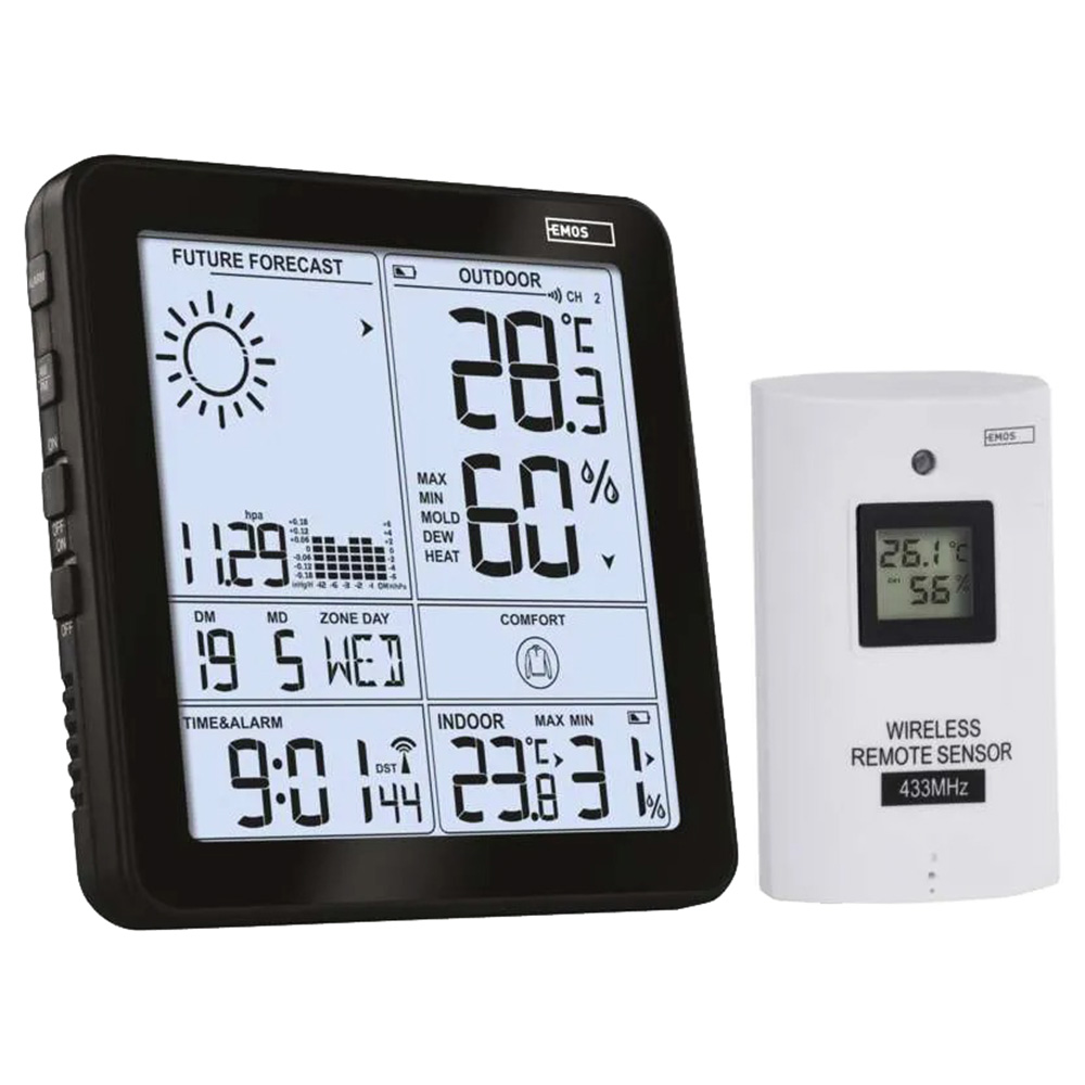 EMOS E5080 – сучасна цифрова метеостанція з великим, зручним для читання дисплеєм і виносним датчиком з дротовим сенсором. Вона стане надійним помічником у щоденному моніторингу погодних умов та мікроклімату в приміщенні, а також може виконувати функції годинника, будильника, календаря.