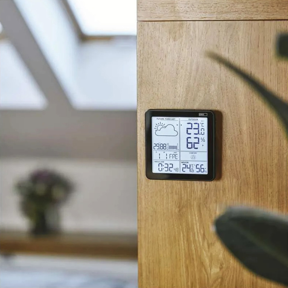 Прилад вимірює температуру та вологість у місці встановлення, а вбудований барометр визначає атмосферний тиск, який відображається як у цифровому вигляді, так і у формі графічної історії за останні 12 годин. На основі змін атмосферного тиску метеостанція формує символьний прогноз погоди на найближчі 12-24 години. Дані про зовнішню температуру й вологість надходять від виносного датчика. Корисним доповненням є відображення індексу одягу – іконка рекомендованого вбрання змінюється залежно від зовнішньої температури. Крім того, можна переглянути інформацію про ризик появи плісняви, точку роси та індекс спеки. На дисплеї також відображаються час, дата й день тижня, а два незалежні будильники з можливістю відкладення сигналу допомагають прокидатися вчасно.