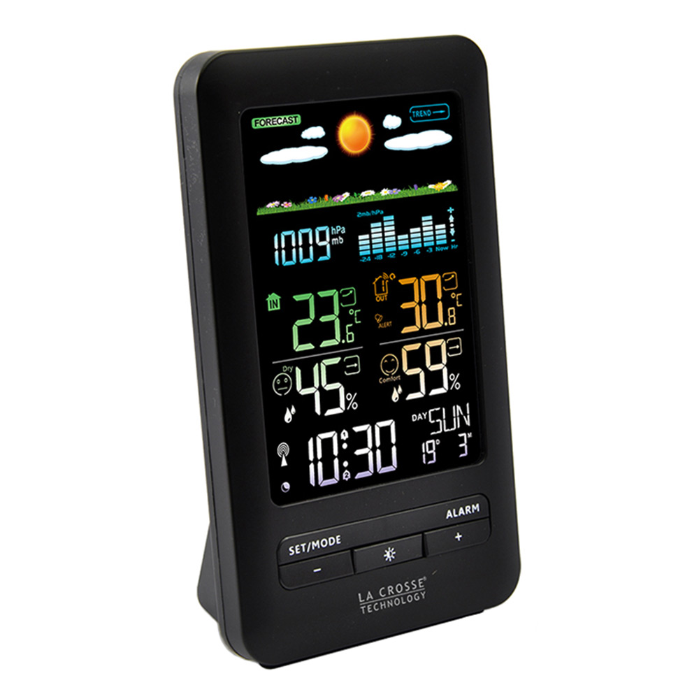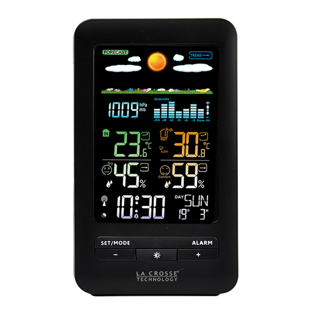 La Crosse WS6205 Black – це домашня метеостанція у компактному корпусі з кольоровим дисплеєм, на якому відображаються найнеобхідніші погодні дані.