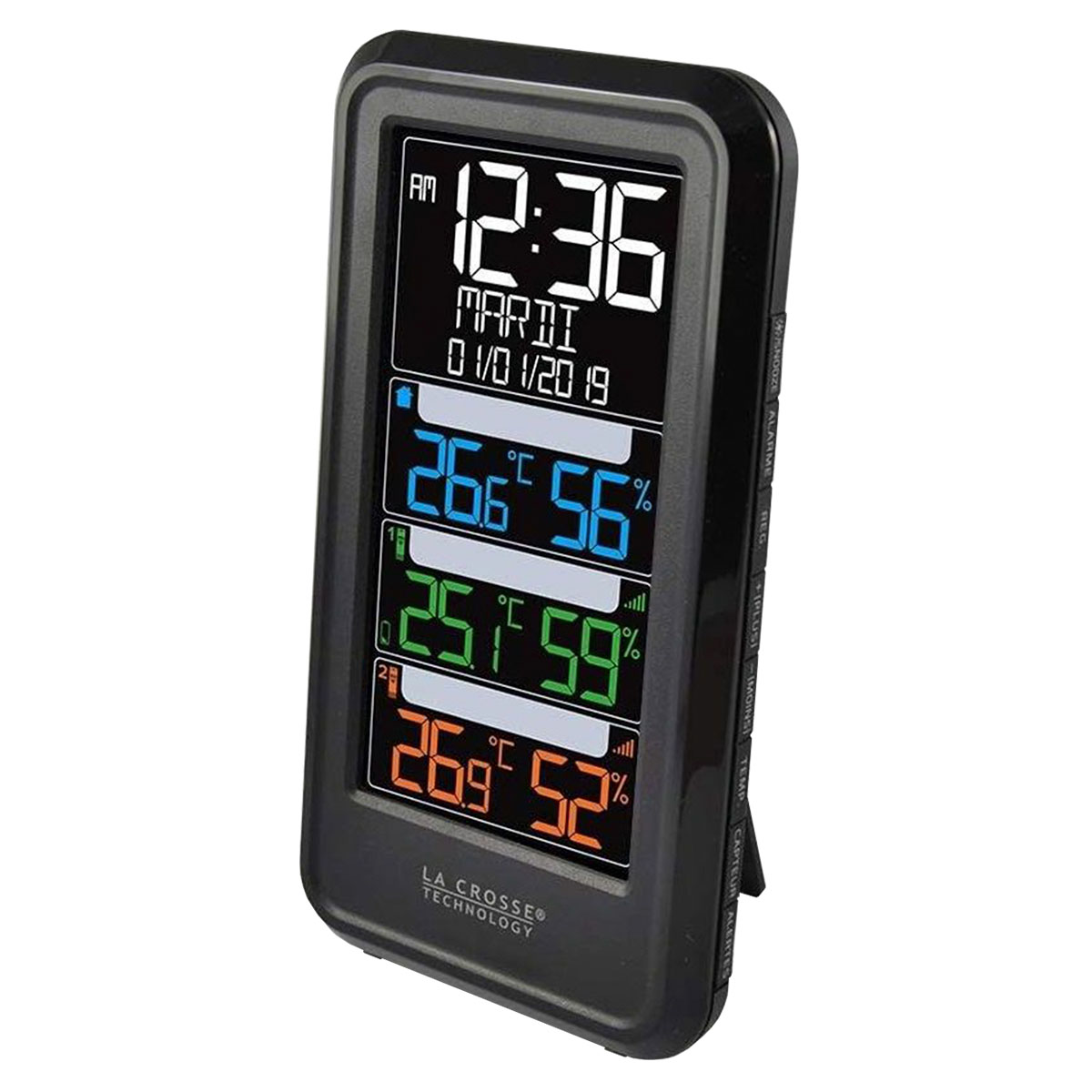 Метеостанція La Crosse WS6813 Black дозволяє вимірювати температуру і відносну вологість всередині та зовні приміщень. За допомогою двох датчиків, які входять до комплекту, контролювати показники відразу в трьох зонах. Також прилад визначає температуру точки роси (Dew Point) та індекс теплового комфорту (Heat Index). Яскравість кольорового дисплея метеостанції може налаштовуватись вручну або можна встановити автоматичне регулювання залежно від навколишнього освітлення у приміщенні.