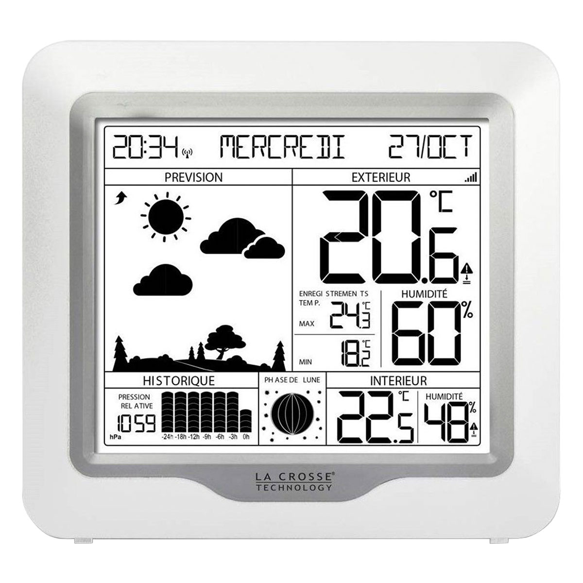 Метеостанція La Crosse WS6822 White/Silver – багатофункціональна погодна станція з прогнозом погоди на найближчі 12 годин, вимірюванням внутрішньої і зовнішньої температури й відносної вологості, відображенням фаз Місяця та відображенням атмосферного тиску з графіком на 24 години. Також прилад визначає температуру точки роси (Dew Point) та індекс спеки (Heat Index). Уся актуальна інформація як у приміщенні, так і ззовні виводиться на великий монохромний дисплей.