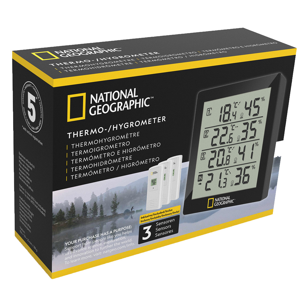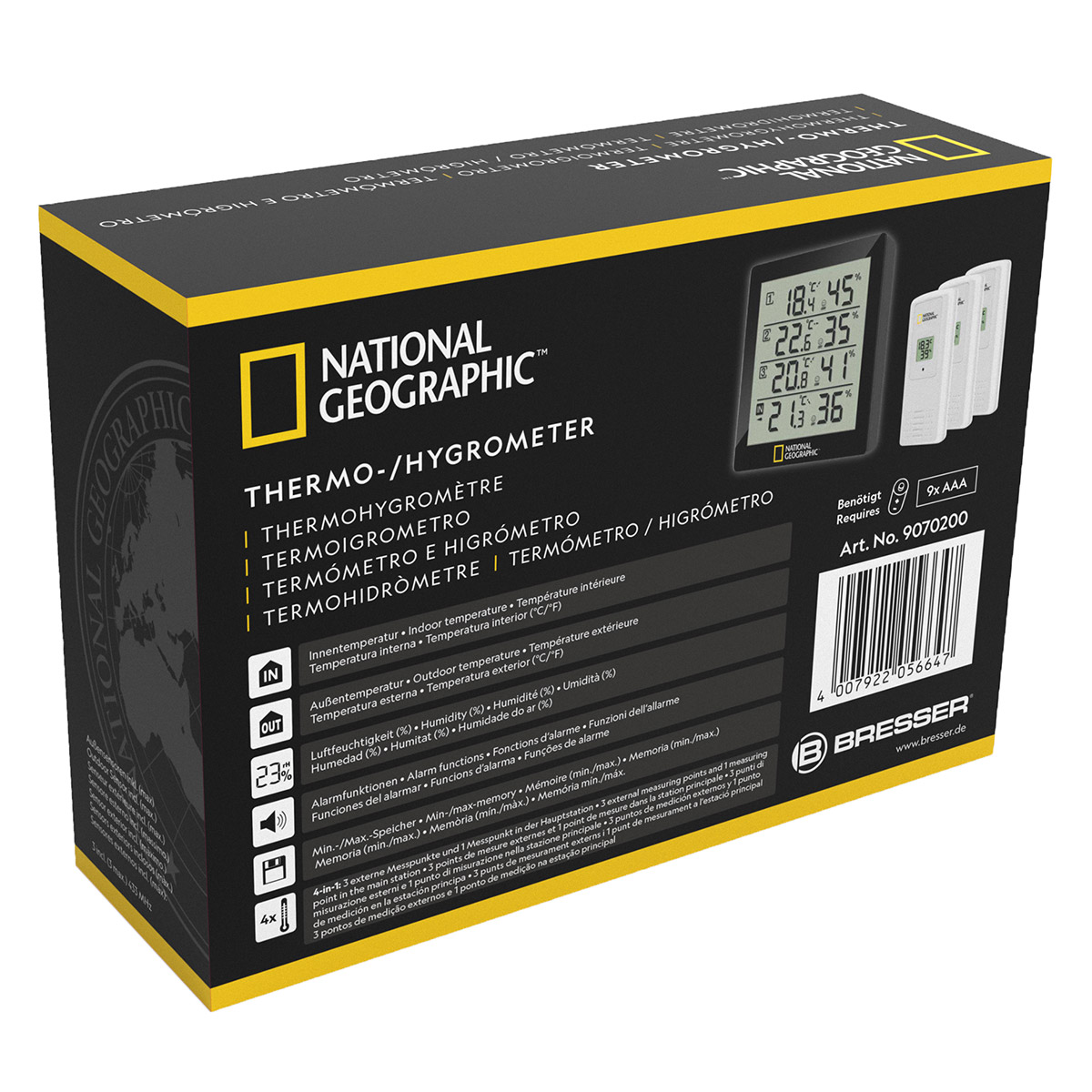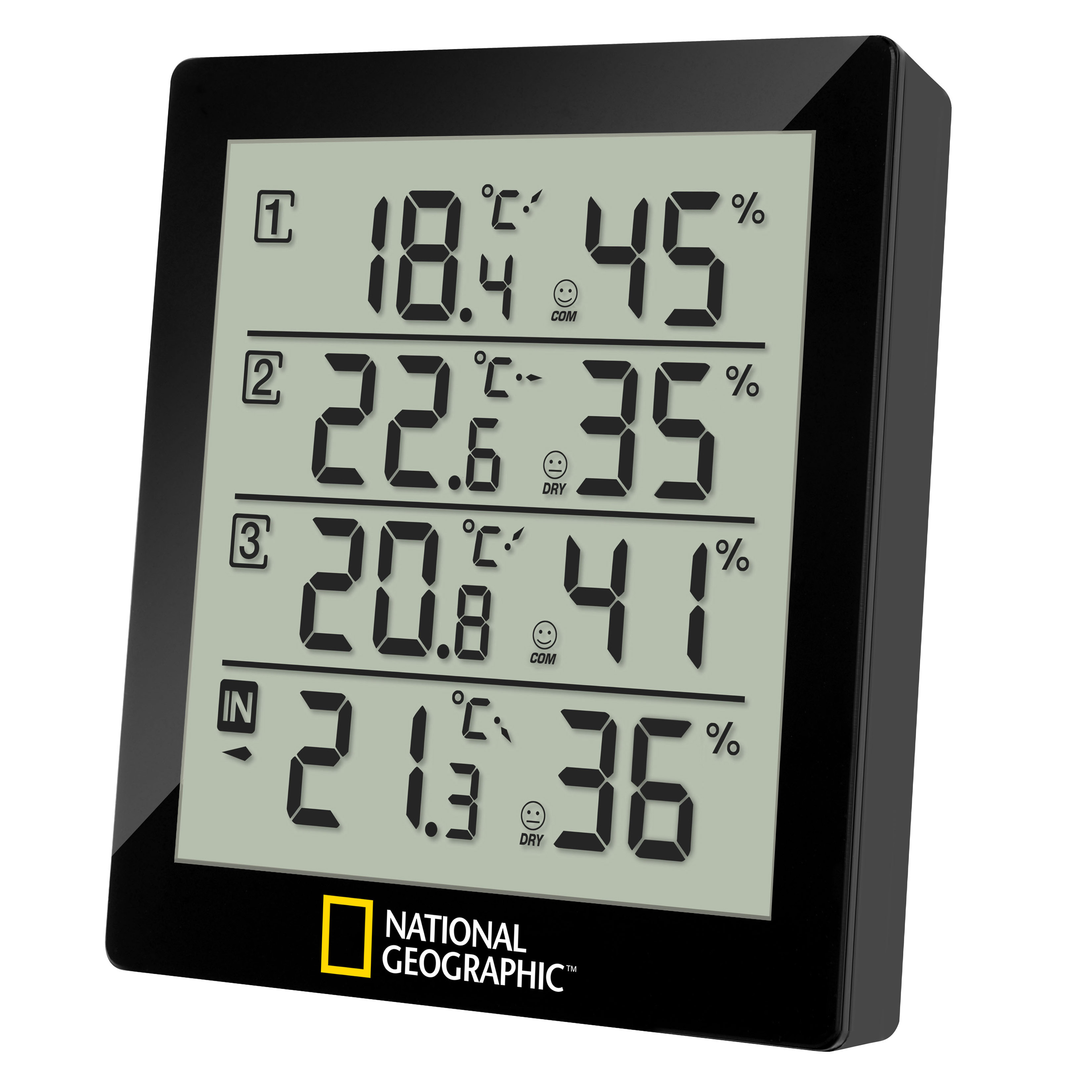 National Geographic 4 Measurement Results Black – це метеостанція, що дозволяє стежити за температурою та вологістю всередині або зовні вашого будинку в 4-х місцях одночасно. Моніторинг кліматичних умов виконується в одній точці – це приймальна станція чорного кольору з LCD-екраном діагоналлю 12.4 см. В комплект також входять 3 виносні датчики. Датчики розраховані на встановлення як у приміщенні, так і на свіжому повітрі.