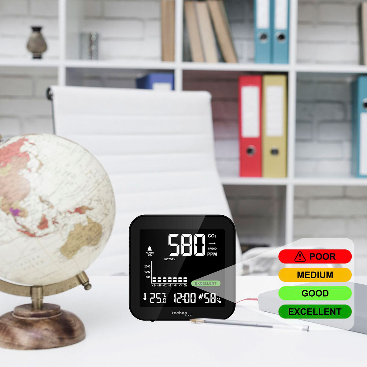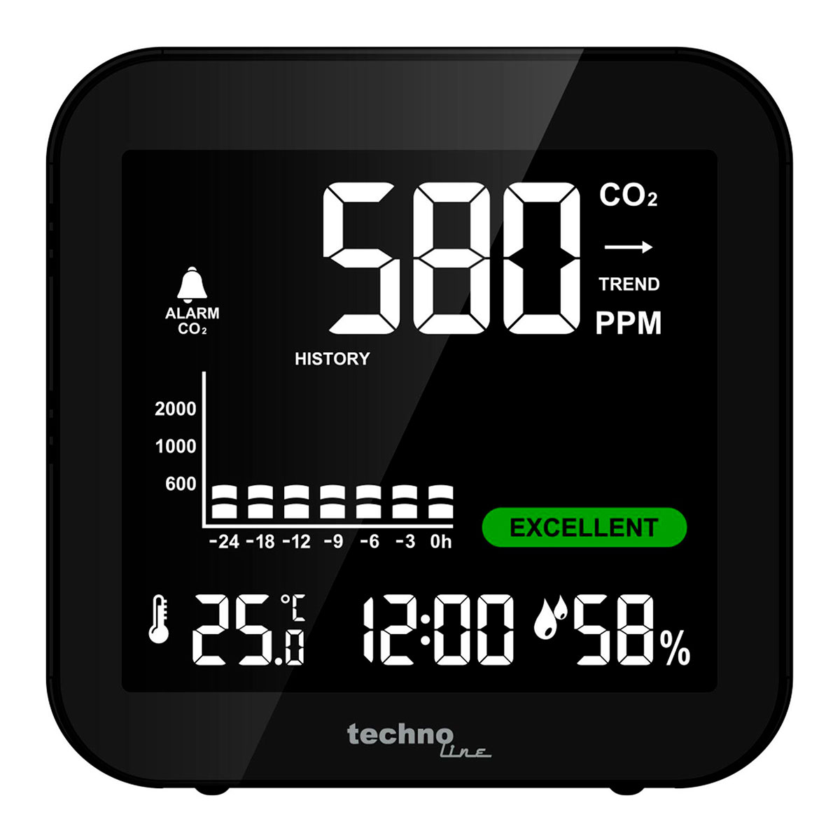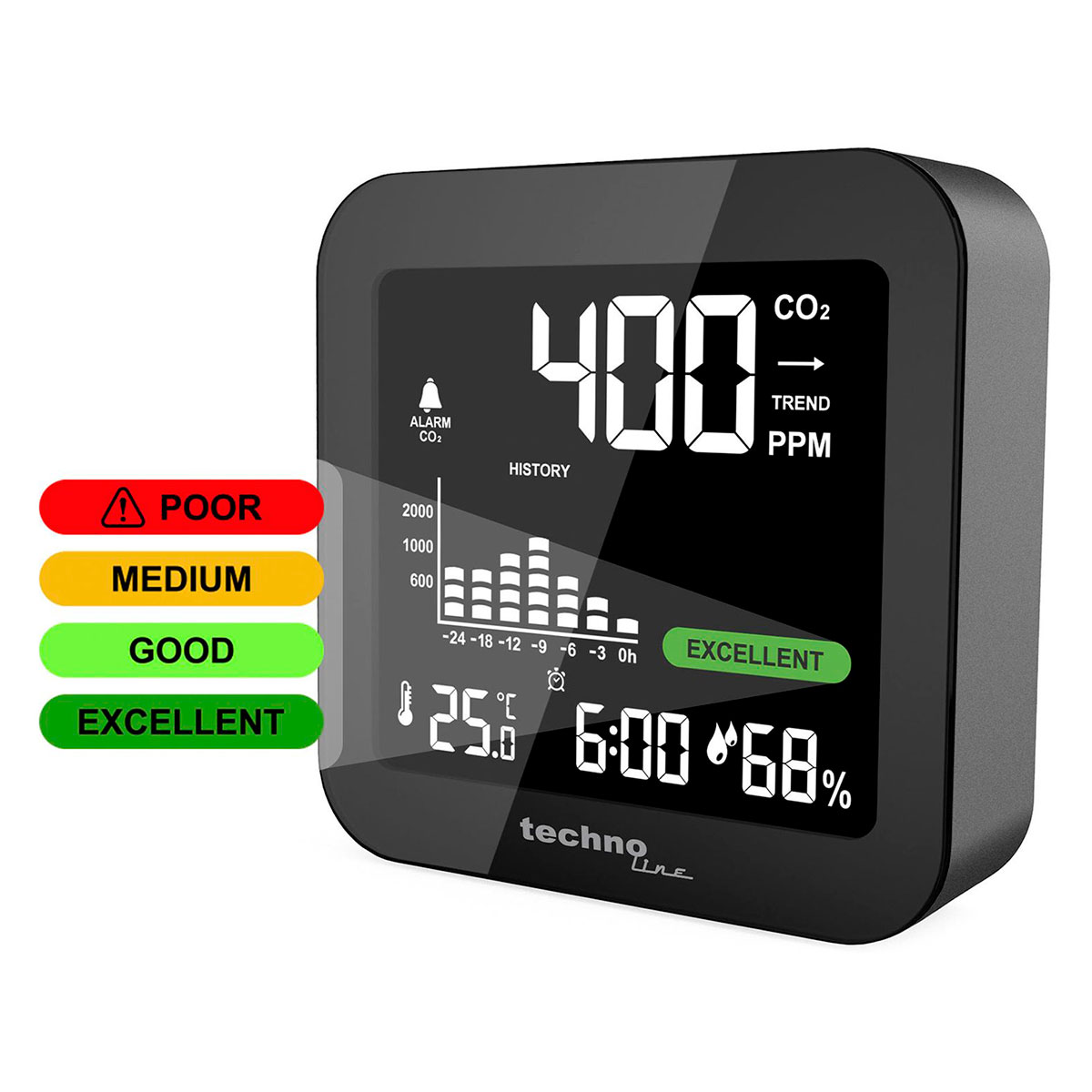 Метеостанція Technoline WL1025 Black з інфрачервоним аналізатором концентрації CO2 – це універсальний прилад від німецької компанії Technoline. Вона попередить про погіршення якості повітря в приміщенні за допомогою кольорових позначок на екрані, або звуковим сигналом (при високому рівні CO2).