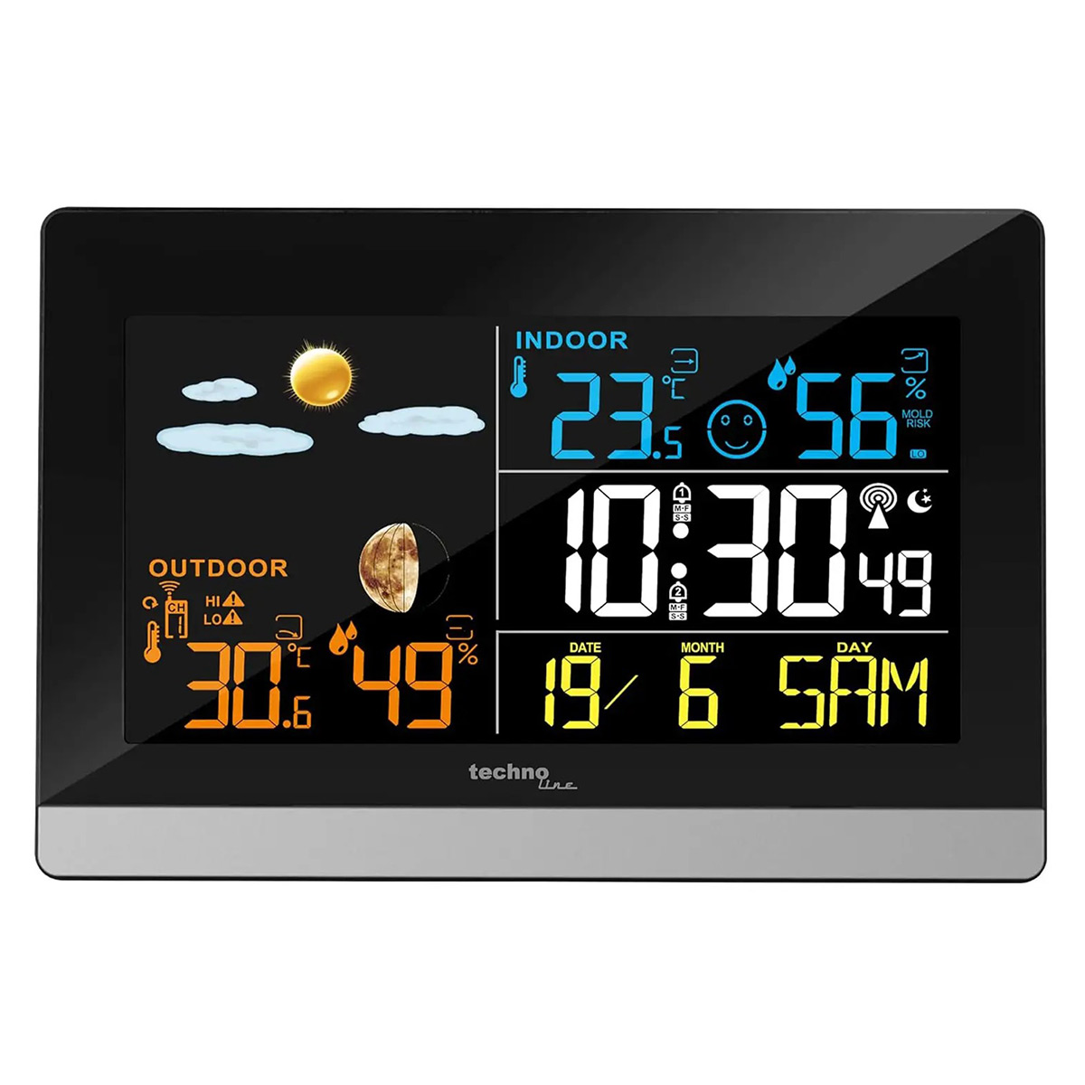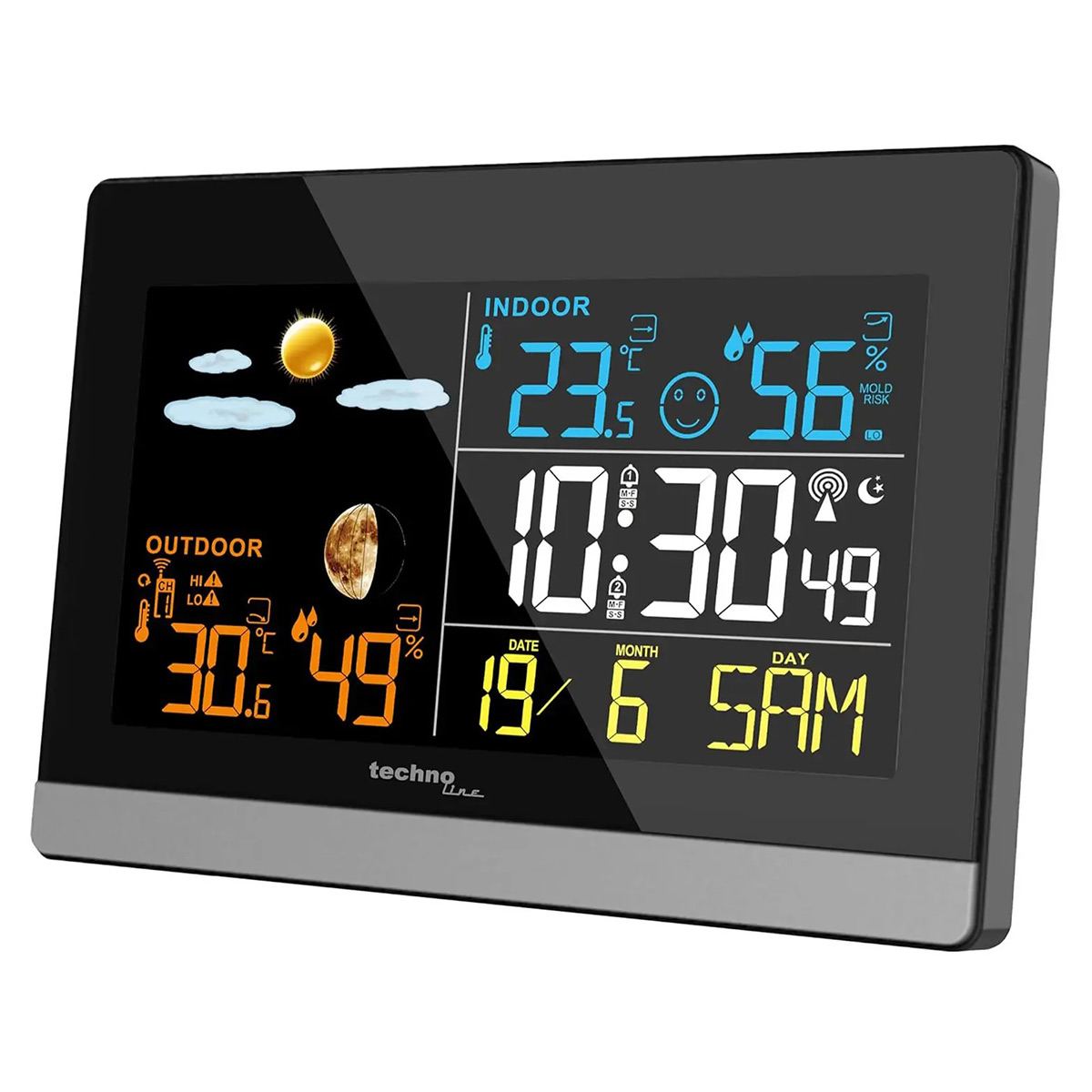 Дана модель має можливість відображати температуру і вологість зовнішнього середовища завдяки комплектному виносному датчику. Крім стандартного вимірювання температури і вологості у приміщенні, прилад інформує про небезпеку появи плісняви та внутрішній клімат у вигляді того чи іншого смайлика. Завдяки символьному прогнозу погоди на 12 годин та звуковому сигналу про вихід температури за встановлені межі, ви завжди будете знати, як одягнутися за погодою. Також можна активувати попередження про заморозки/ожеледицю, що може бути дуже корисно для автомобілістів. Додатково прилад оснащений функціями годинника з будильником та календаря, ще одним приємним бонусом стане змога спостерігати поточні фази Місяця.