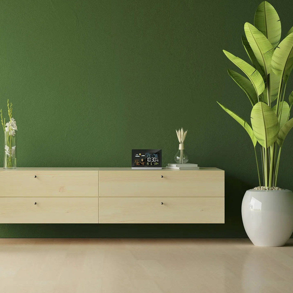 Підвищенню зручності користування сприяє відображення за допомогою стрілок вгору/вбік/вниз тенденцій температури та вологості. На кольоровому рідкокристалічному дисплеї чітко видно всі числа та піктограми. А регульована LED-підсвітка дозволяє налаштувати яскравість відповідно до індивідуальних вподобань та умов освітлення.