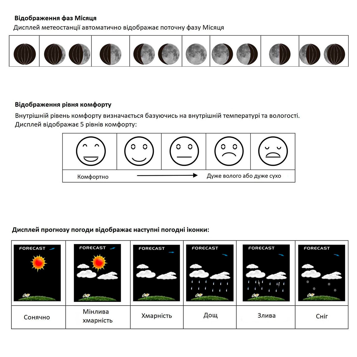 - Символьний прогноз погоди. На дисплеї відображаються погодні іконки (ясно, змінна хмарність, хмарно, дощ, злива, сніг)