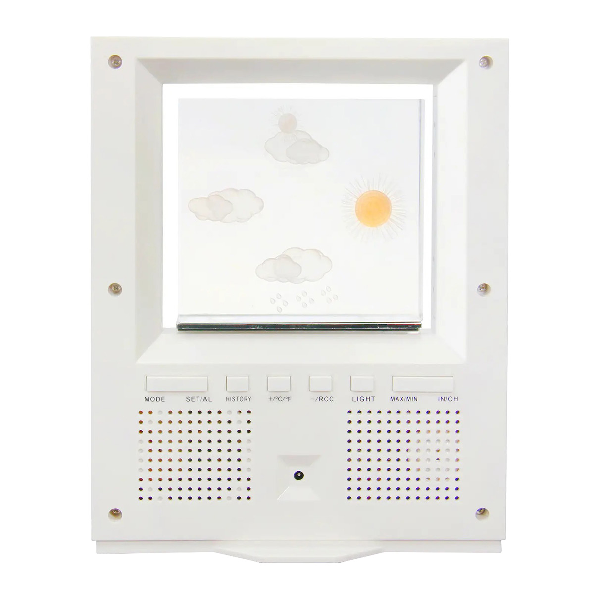Метеостанція вимірює температуру і вологість у приміщенні, а також має можливість транслювати температуру і вологість зовнішнього середовища завдяки комплектному бездротовому виносному датчику. На лаконічному монохромному дисплеї також відображається цифровий показник поточного атмосферного тиску та його історія за останні 12 годин. У верхній частині метеостанції знаходиться спеціальний блок з прогнозом погоди на наступні 12-24 години. Він має високу точність, оскільки формується на основі зміни тиску, температури та вологості. Прогноз відображається за допомогою підсвічування відповідного погодного символу, який можна побачити з будь-якої точки кімнати. Щоб забезпечити кращу видимість, рекомендується уникати розміщення метеостанції перед джерелами яскравого світла, такими як вікно чи настільна лампа.